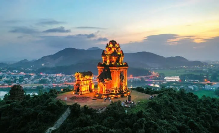Sự hòa quyện giữa vẻ đẹp kiến trúc Chăm cổ kính và khung cảnh thiên nhiên hùng vĩ của "vùng đất võ" Bình Định. (Ảnh: Thanh Tùng/TTXVN)