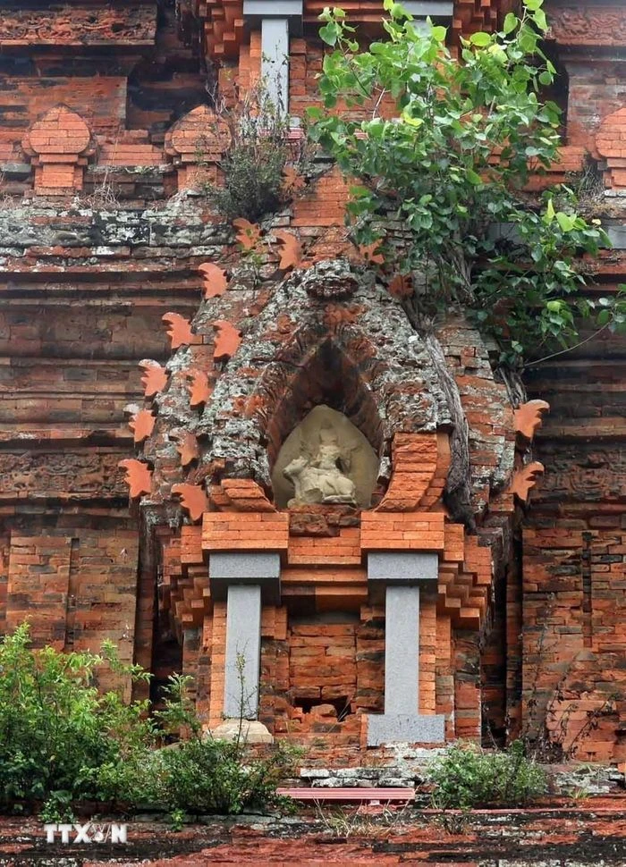 Góc nhìn cận cảnh vào các chi tiết điêu khắc trên Tháp Bánh Ít, cho thấy sự tinh tế và sáng tạo của nghệ nhân Chăm cổ. (Ảnh: Nhật Anh/TTXVN)