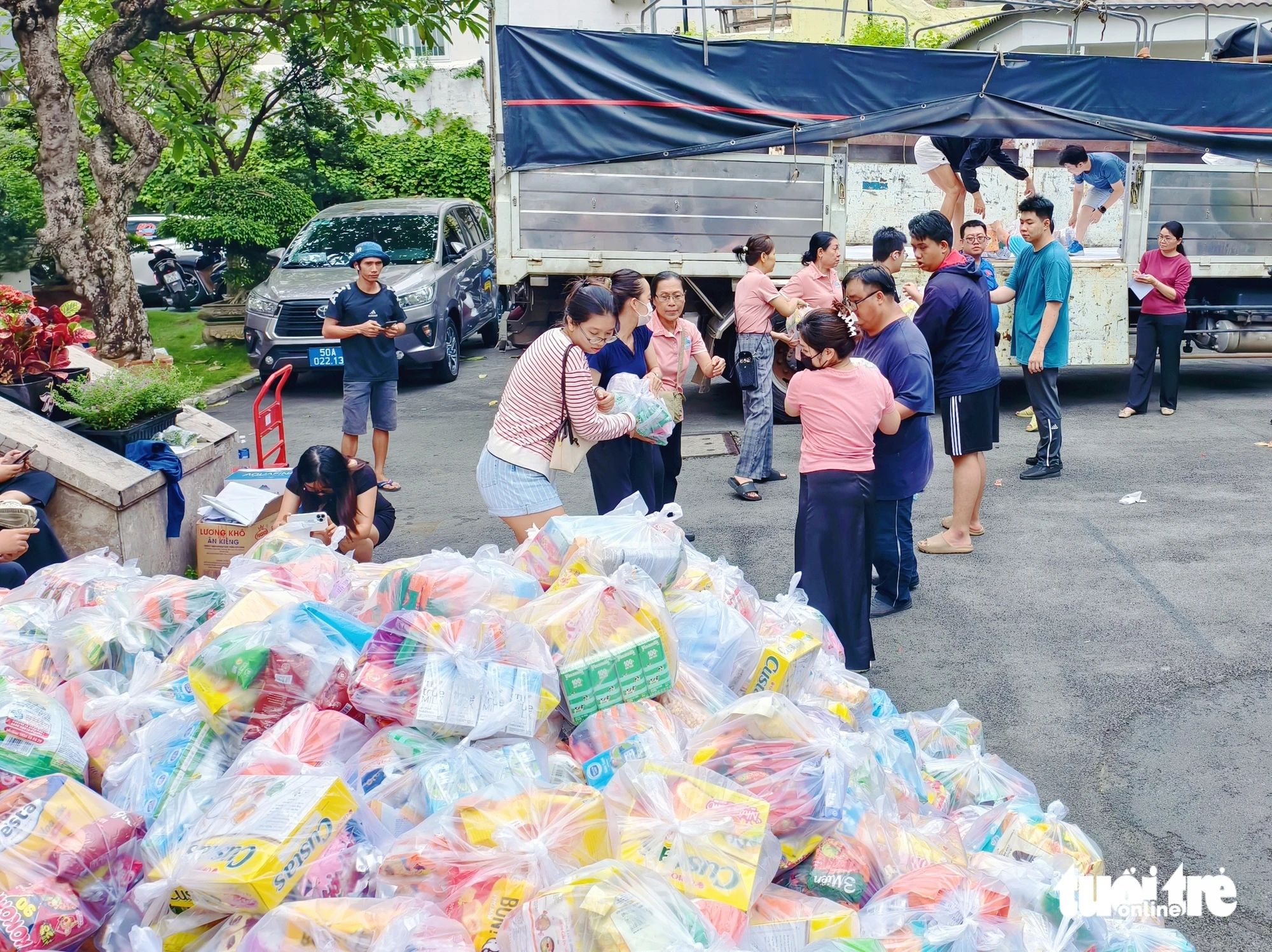 Nhiều người cùng chung tay đóng các bịch hàng hóa chuẩn bị chuyển đi hỗ trợ đồng bào vùng lũ – Ảnh: NGỌC KHẢI