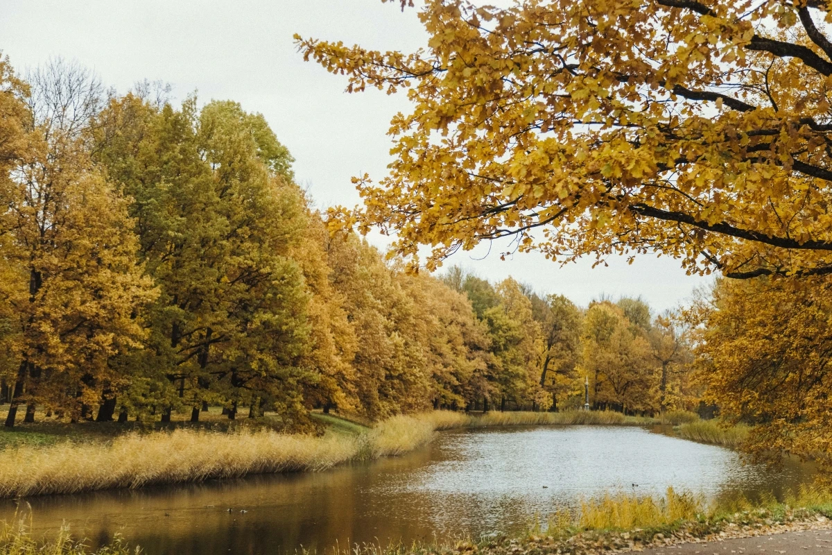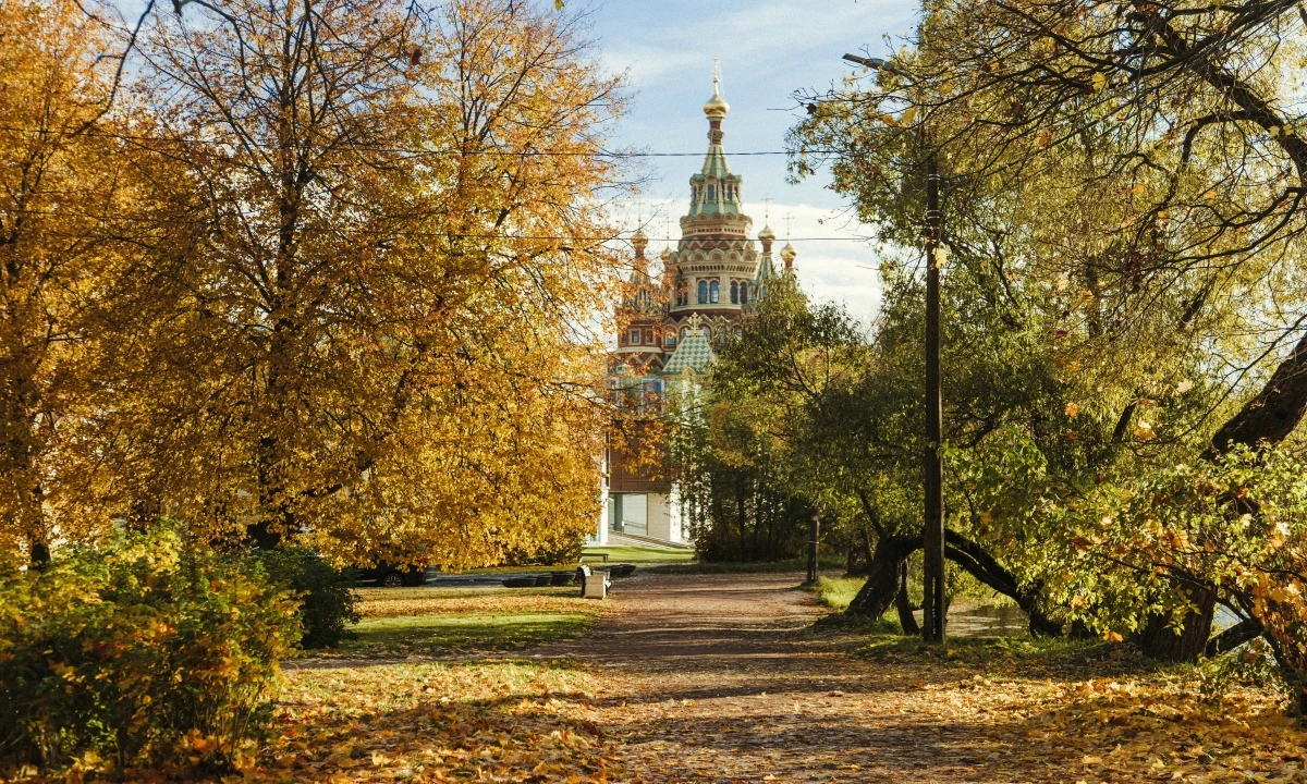 Lá vàng phủ kín thành phố Pushkin, Saint Petersburg.
