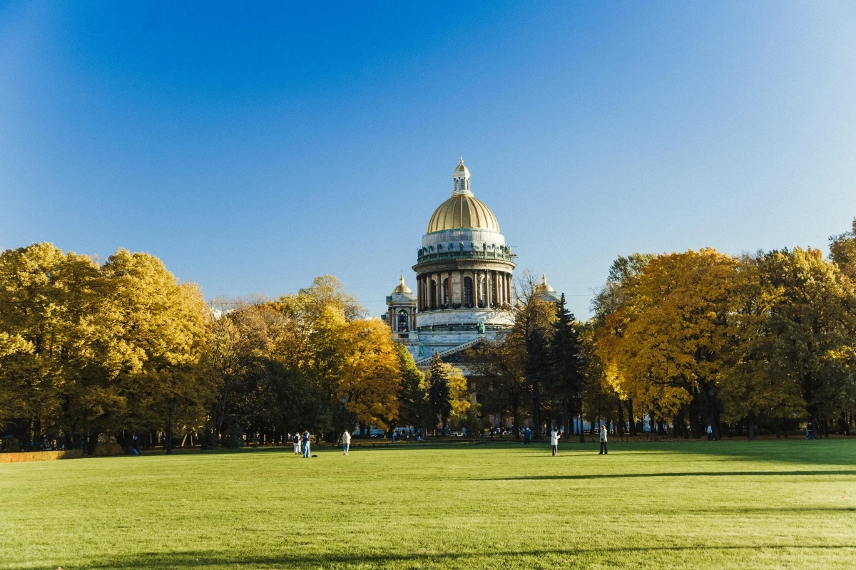 Một điểm ngắm lá mùa thu khác ở Saint Petersburg là Nhà thờ Thánh Isaac, công trình tôn giáo gây ấn tượng với mái vòm mạ vàng và nội thất dát đá cẩm thạch.