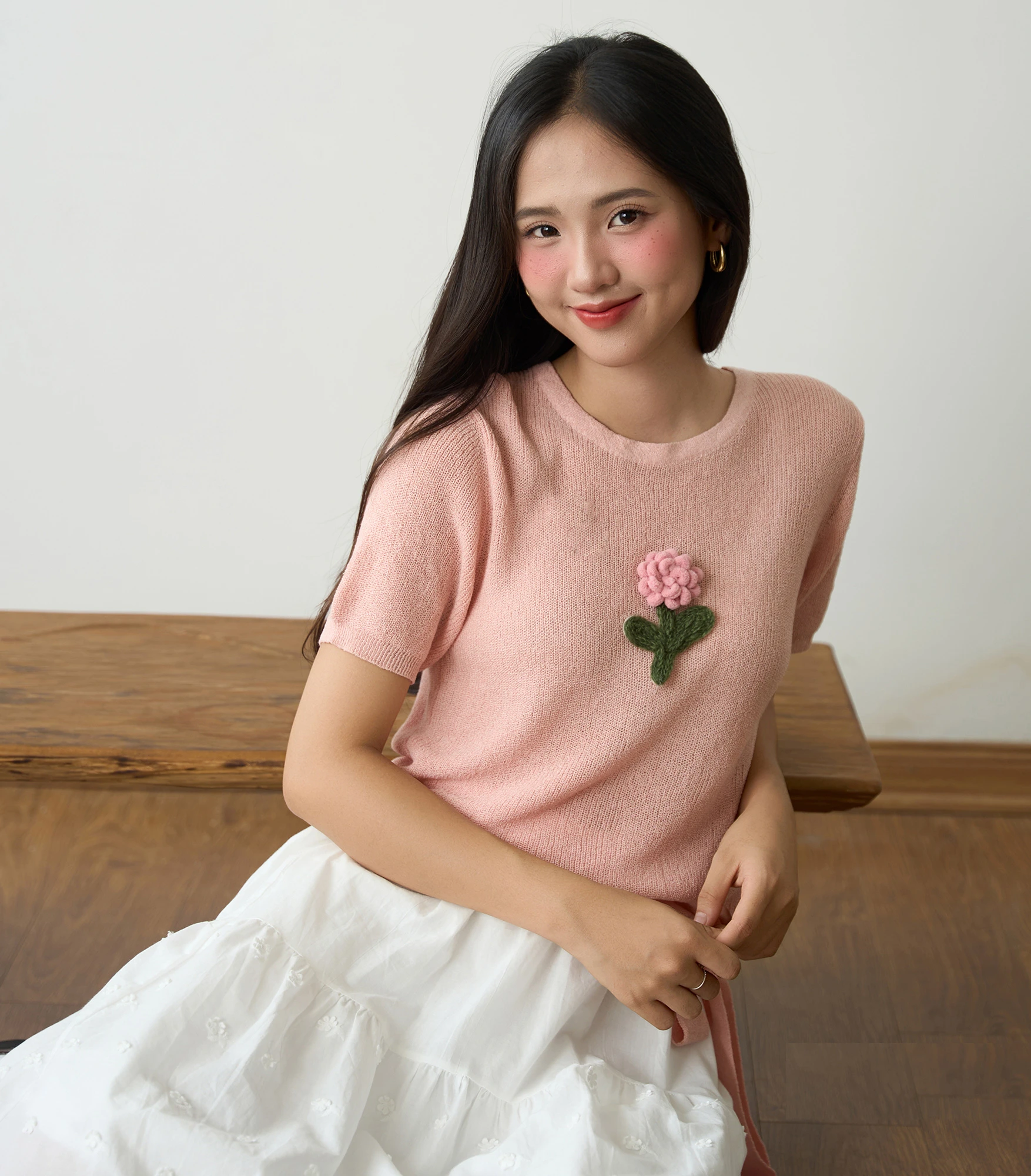 Mongtoghi màu hồng đào có chi tiết hoa kết tay tạo điểm nhấn, phối chân váy trắng xếp tầng cực kỳ duyên dáng và trẻ trung . ẢNH: MADELEN