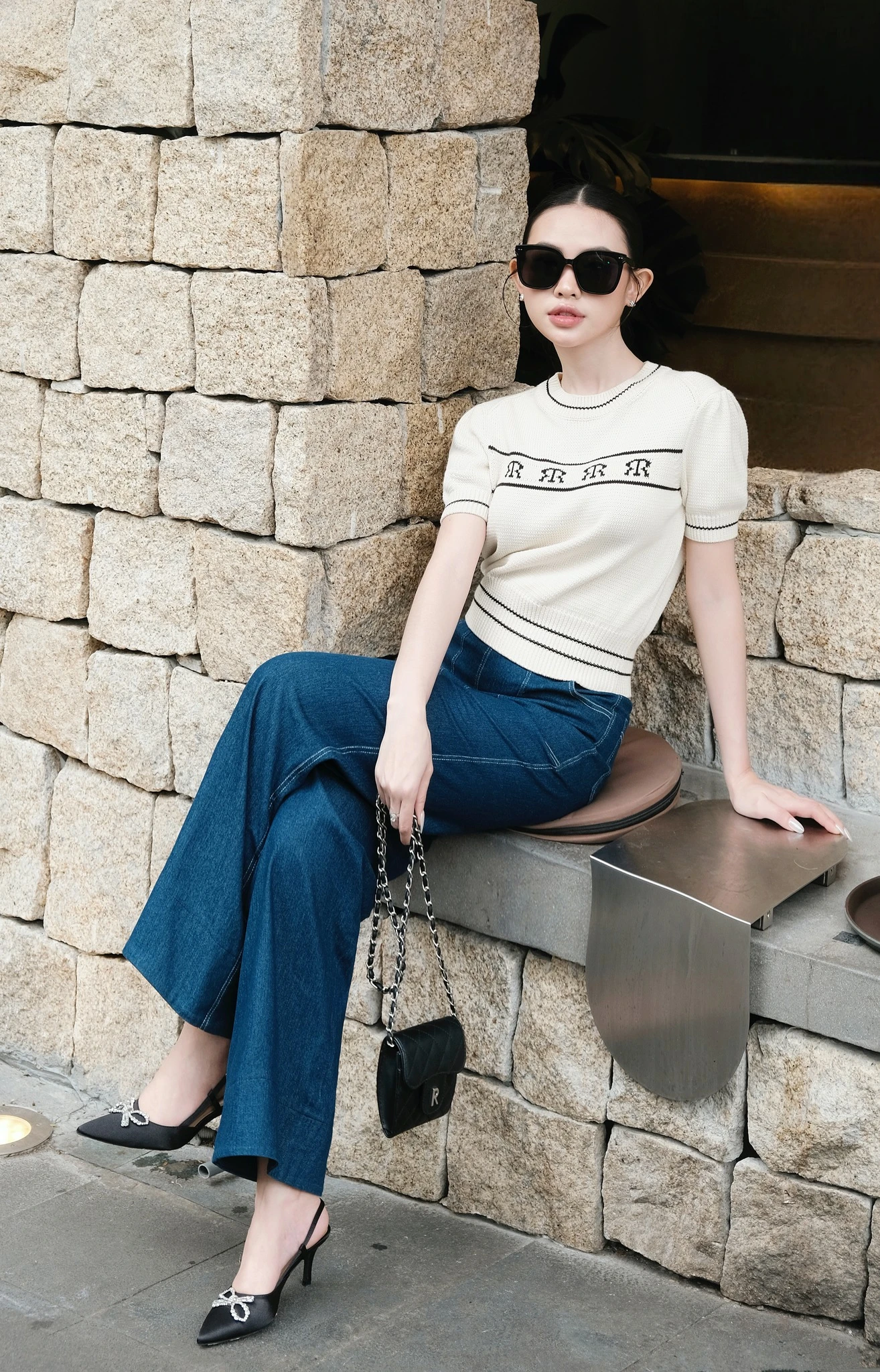 Dạo phố, đi làm, đi học cùng cặp đôi quần jeans xanh và áo dệt kim họa tiết monogram, bổ sung thêm giày cao gót, túi xách mini đeo vai và một chiếc kính mát thời trang