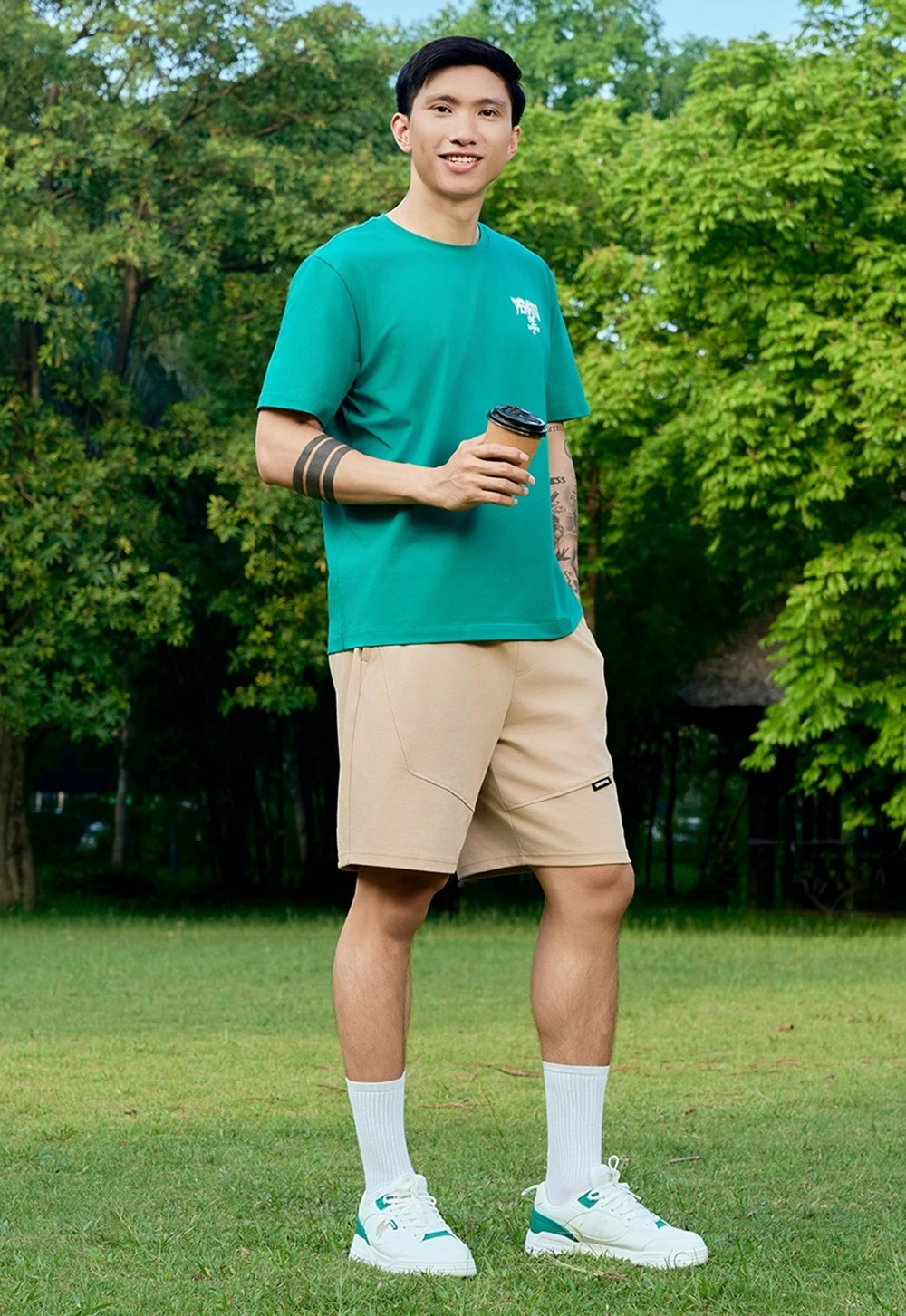 Một bản phối chuẩn gu cho những buổi cà phê sáng, dạo công viên hay gặp gỡ bạn bè cuối tuần. Gam màu xanh lá nổi bật của áo phông kết hợp cùng quần lửng màu be trung tính, tạo điểm nhấn hài hòa và trẻ trung