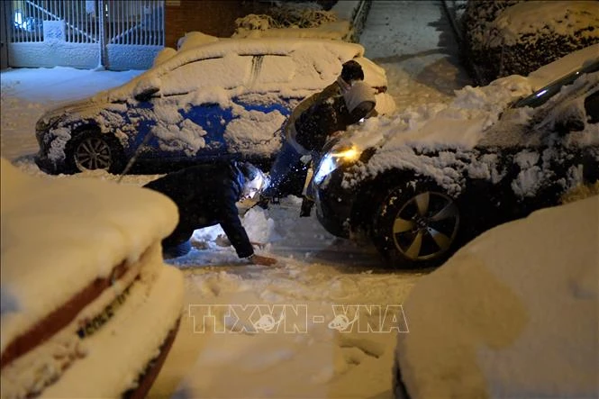 Các phương tiện mắc kẹt do tuyết rơi dày đặc tại Madrid, Tây Ban Nha. Ảnh tư liệu: AFP/TTXVN