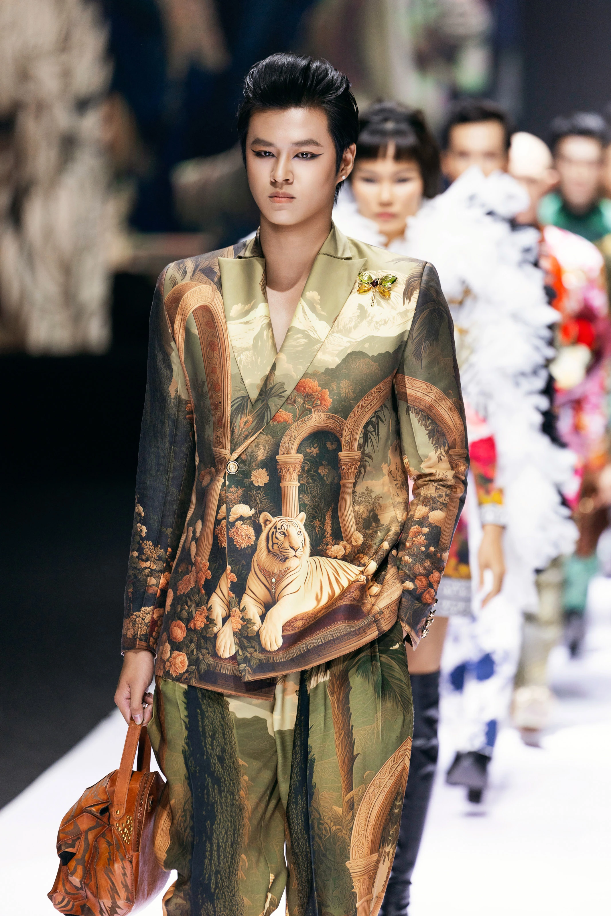 Gần 30 thiết kế menswear cao cấp trong bộ sưu tập mang gam màu trầm ấm - từ trắng ngà, be, vàng rơm đến nâu đất - gợi nên ánh nắng phản chiếu trên những mái ngói cổ của Luang Prabang