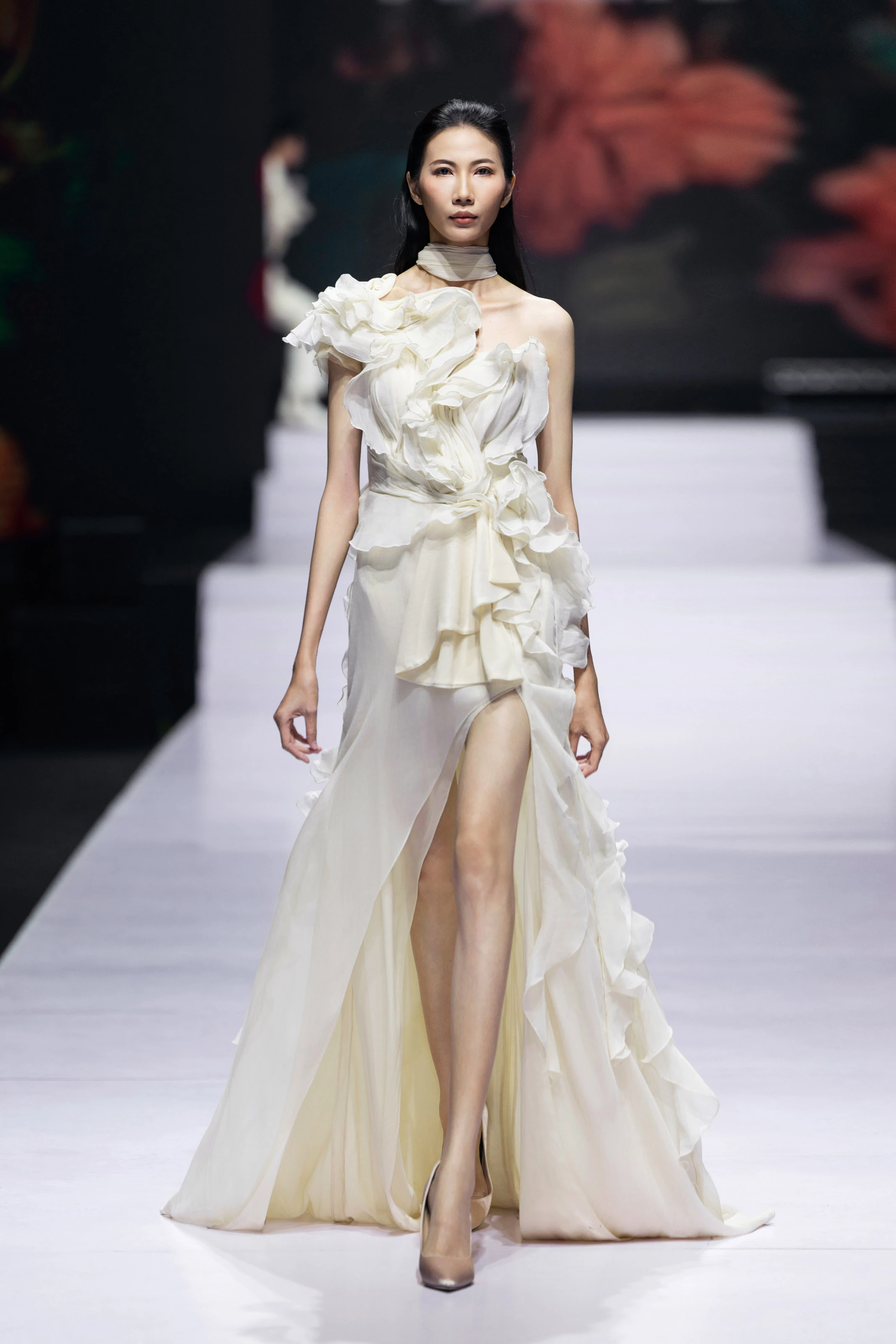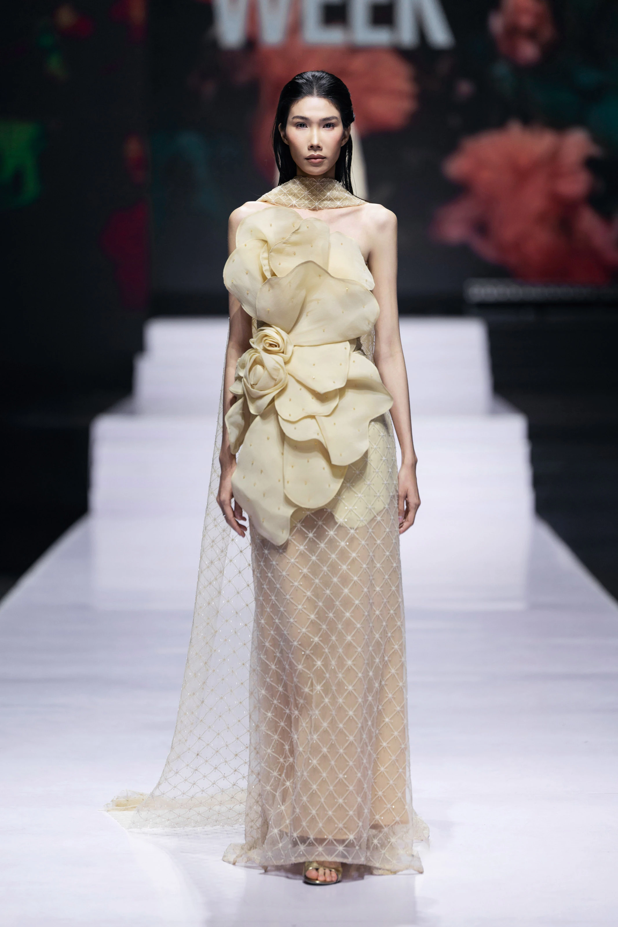 Các phom dáng mềm mại, bay bổng kết hợp với chất liệu voan, lụa và lưới mỏng được xử lý tinh tế tạo nên chuyển động nhẹ như gió mỗi khi sải bước