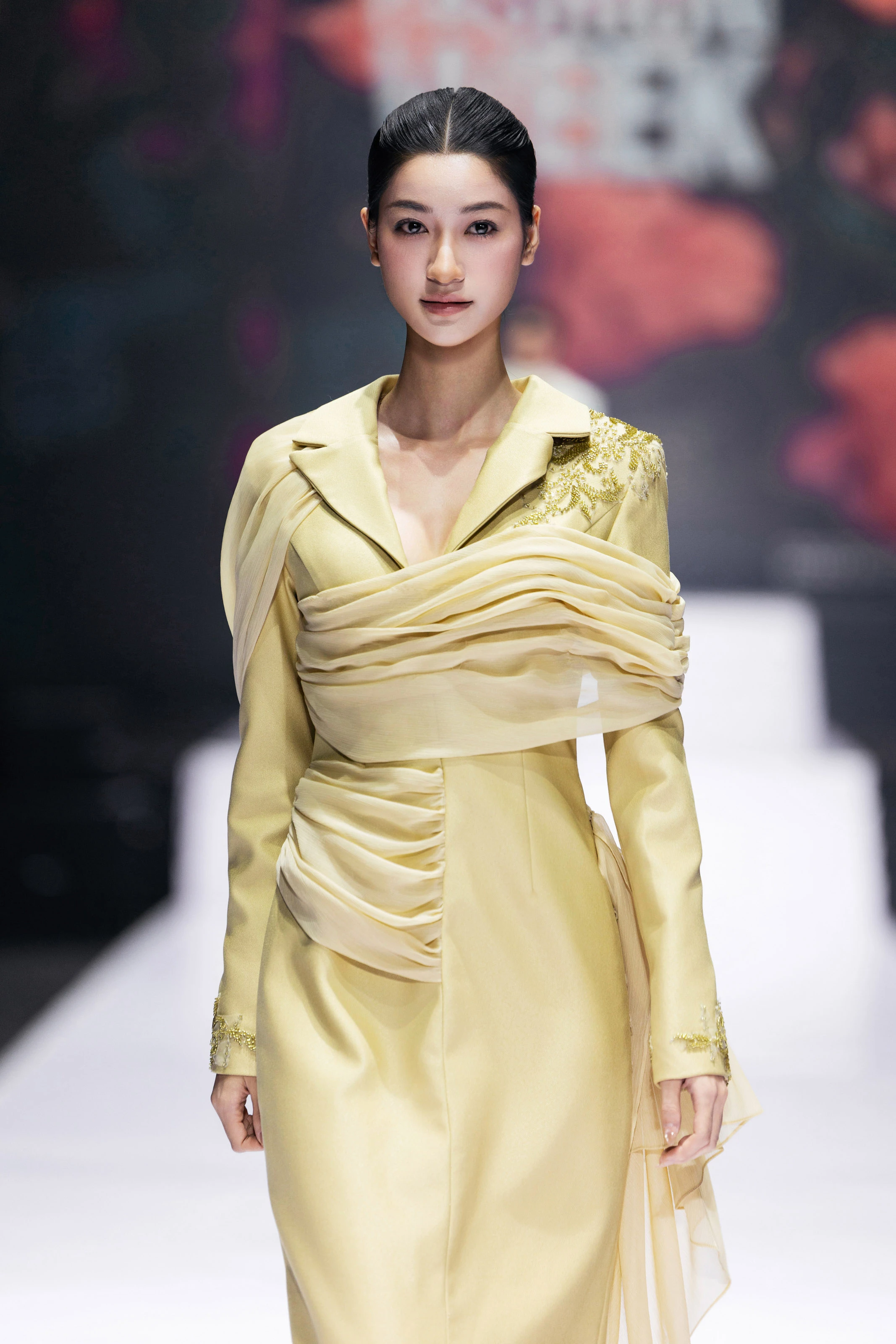 Không chỉ dừng lại ở chất thơ, Natacha Van còn đưa vào BST các thiết kế suit phá cách và tái cấu trúc, mang đến hơi thở hiện đại xen lẫn nét mộng mơ. NTK thể hiện sự khéo léo và tinh tế khi kết hợp độ mềm của vải và cấu trúc phom dáng mạnh mẽ, mang đến góc nhìn cân bằng giữa sự dịu dàng và bản lĩnh