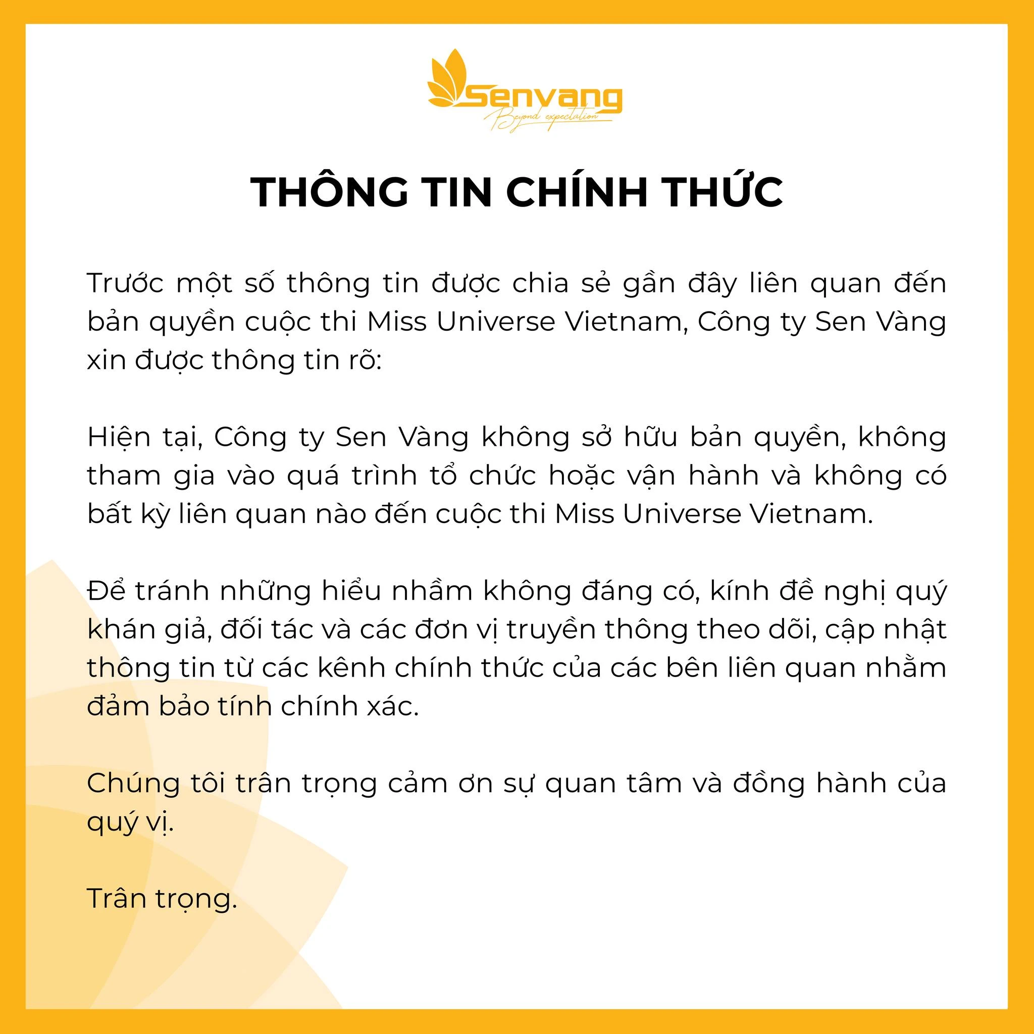 Bên cạnh đó, Sen Vàng cũng đề nghị khán giả, đối tác và các đơn vị truyền thông theo dõi, cập nhật thông tin từ các kênh chính thức của những bên liên quan để đảm bảo tính chính xác, khách quan. Công ty Sen Vàng cho hay: “Công ty Sen Vàng không sở hữu bản quyền, không tham gia vào quá trình tổ chức hoặc vận hành và không có bất kỳ liên quan nào đến cuộc thi Miss Universe Vietnam. Để tránh những hiểu nhầm không đáng có, kính đề nghị quý khán giả, đối tác và các đơn vị truyền thông theo dõi, cập nhật thông tin từ các kênh chính thức của các bên liên quan nhằm đảm bảo tính chính xác”.