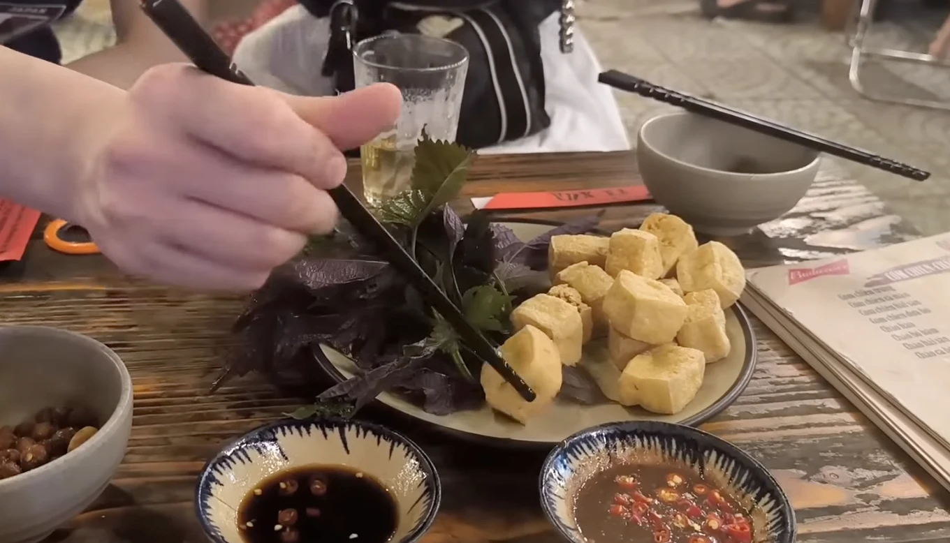 Điều thú vị là Fumitake xuất thân từ một gia đình có truyền thống làm đậu phụ tại Nhật, nhưng anh cũng không khỏi bất ngờ với món đậu rán giòn nóng hổi tại Việt Nam. Khi ăn kèm lá tía tô và chấm mắm tôm, hương vị của món ăn như được nâng lên một tầm mới.