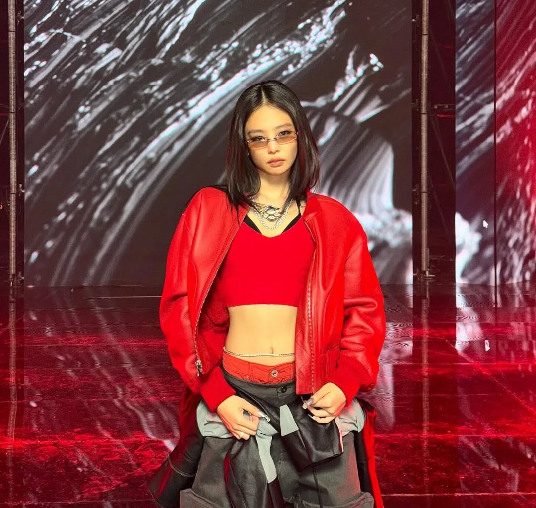 Nối tiếp sự cá tính đó, Jennie lựa chọn chiếc áo khoác da đỏ với bản phối màu linh hoạt . ẢNH: @JENNIERUBYJANE