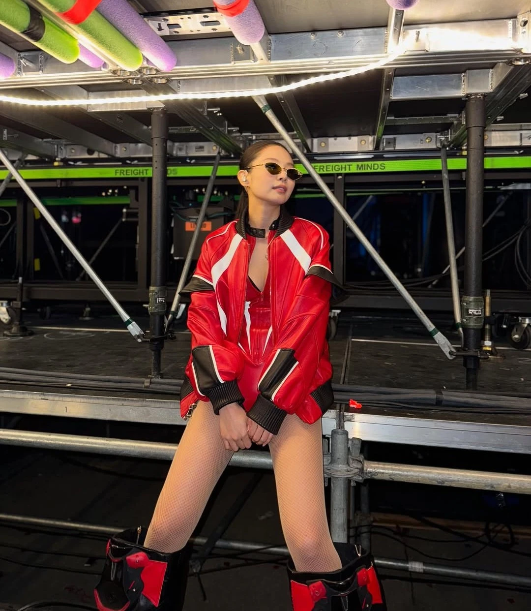 Nữ idol kết hợp bên trong là chiếc jumpsuit tone sur tone nóng bỏng. Jennie khéo léo phối cùng đôi bốt da cao cổ và cặp kính mắt dáng oval sành điệu giúp nữ idol tự tin tỏa sáng trên sân khấu.