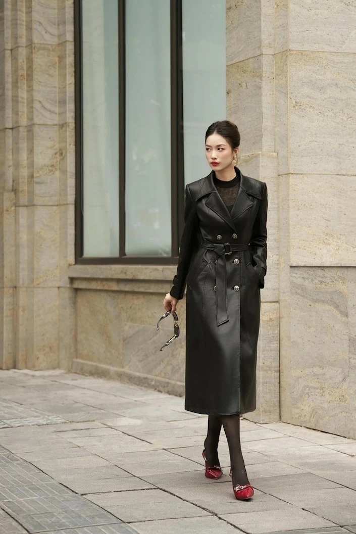 Đan xen giữa nét mạnh mẽ cùng sự kín đáo, nàng diện lên mình chiếc áo khoác da màu nâu dáng dài cực cuốn hút . ẢNH: MY WAY