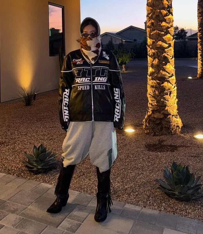 Nữ Idol chọn chiếc áo da thể thao tông đen kết hợp đôi bốt da dáng cao bồi mạnh mẽ. Jennie khéo léo lồng ghép chiếc quần nỉ cá tính và chiếc kính đen quyền lực để hoàn thiện diện mạo đậm chất thể thao.