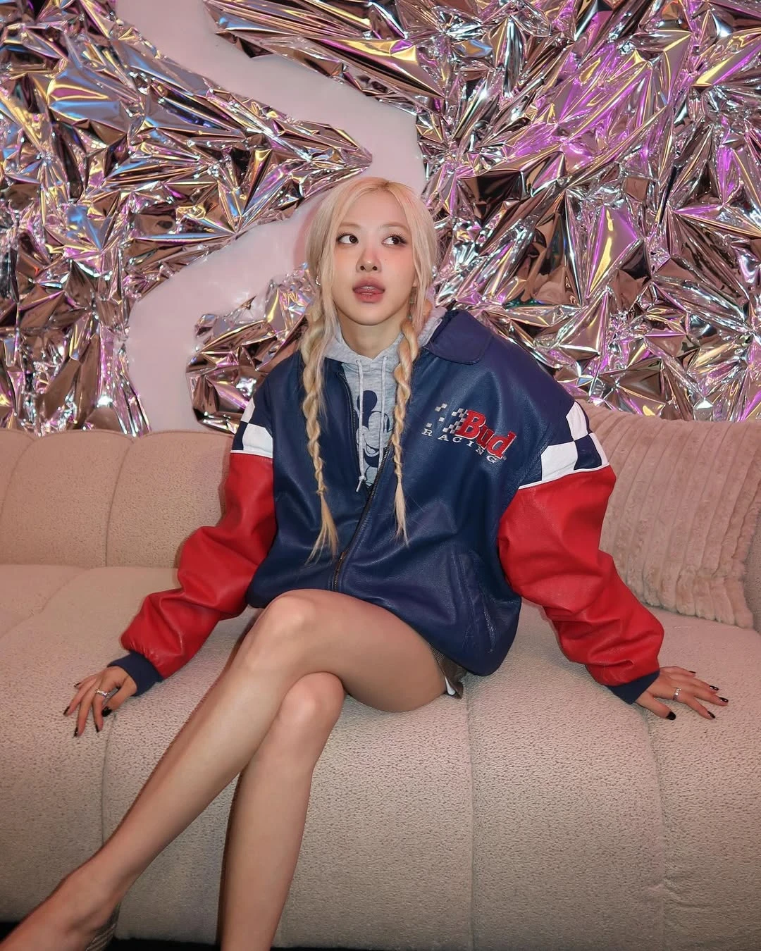 Nữ idol lựa chọn chiếc áo da thể thao rộng giúp cô nàng khéo léo che đi những khuyết điểm và tôn lên đôi chân dài thon gọn. Rose kết hợp cùng chiếc áo hoodie mickey bên trong tạo hiệu ứng layer sắc sảo.