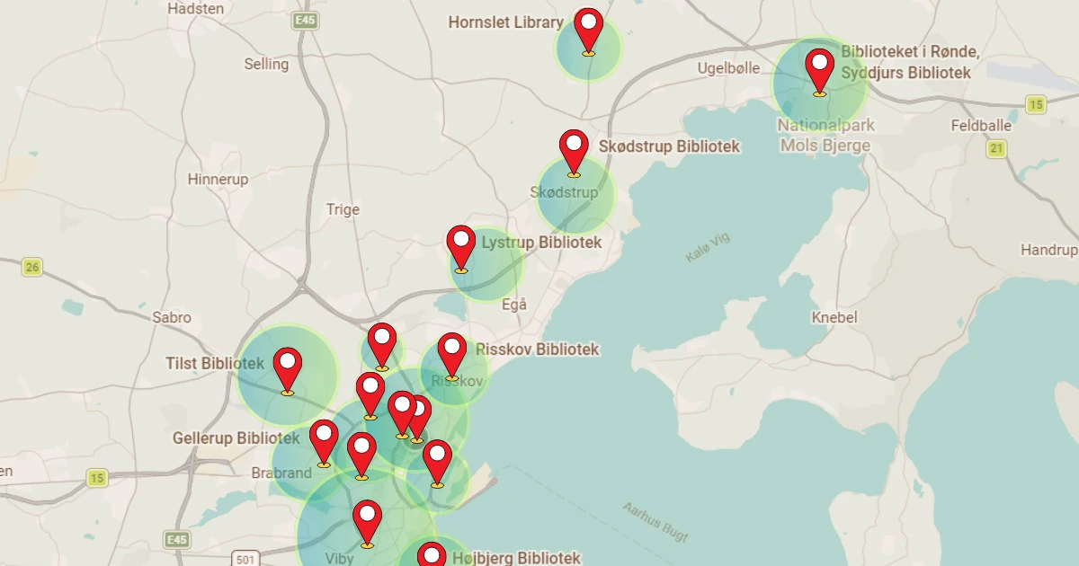 Mật độ thư viện (Bibliotek) và các khu dân cư tại một phần miền trung Jutland (Đan Mạch).