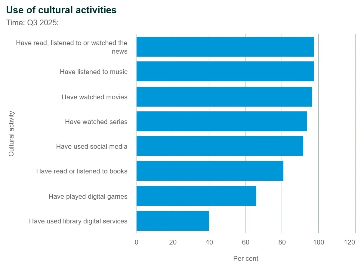 Đến năm 2025, xu hướng này càng rõ nét hơn. Người dân Đan Mạch ngày càng ưu tiên các hình thức giải trí khác như âm nhạc, phim ảnh, series truyền hình hay tin tức – những nội dung có tỷ lệ tiếp cận gần như tuyệt đối, dao động từ 90 – 100%. Trong bối cảnh đó, sách lại bị đẩy xuống vị trí thứ yếu dù vẫn đạt khoảng 80%.