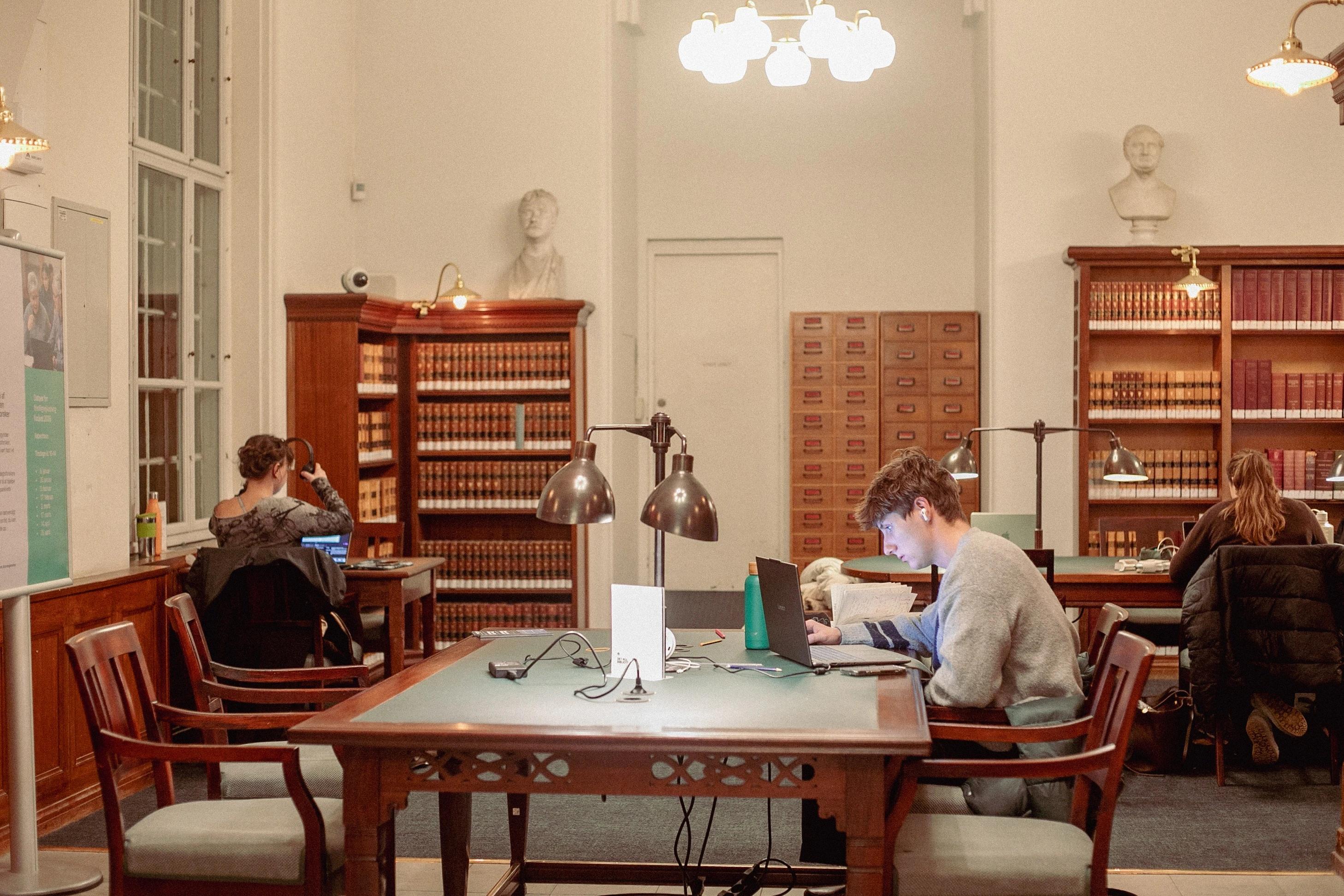 Khác với Dokk1, nơi đây mang dáng dấp của một không gian học thuật nghiêm ngặt: những phòng đọc lớn, tĩnh lặng tuyệt đối, hạn chế thiết bị ghi hình và gần như không có tiếng động. Dù vậy, vào mỗi buổi tối, từng chỗ ngồi đều kín, phản ánh nhu cầu học tập cao của sinh viên đô thị. Tình trạng tương tự cũng diễn ra tại các thư viện chuyên ngành Khoa học xã hội trên phố Gothersgade, nơi việc tìm một chỗ ngồi trống gần như khó hơn cả cầu may.