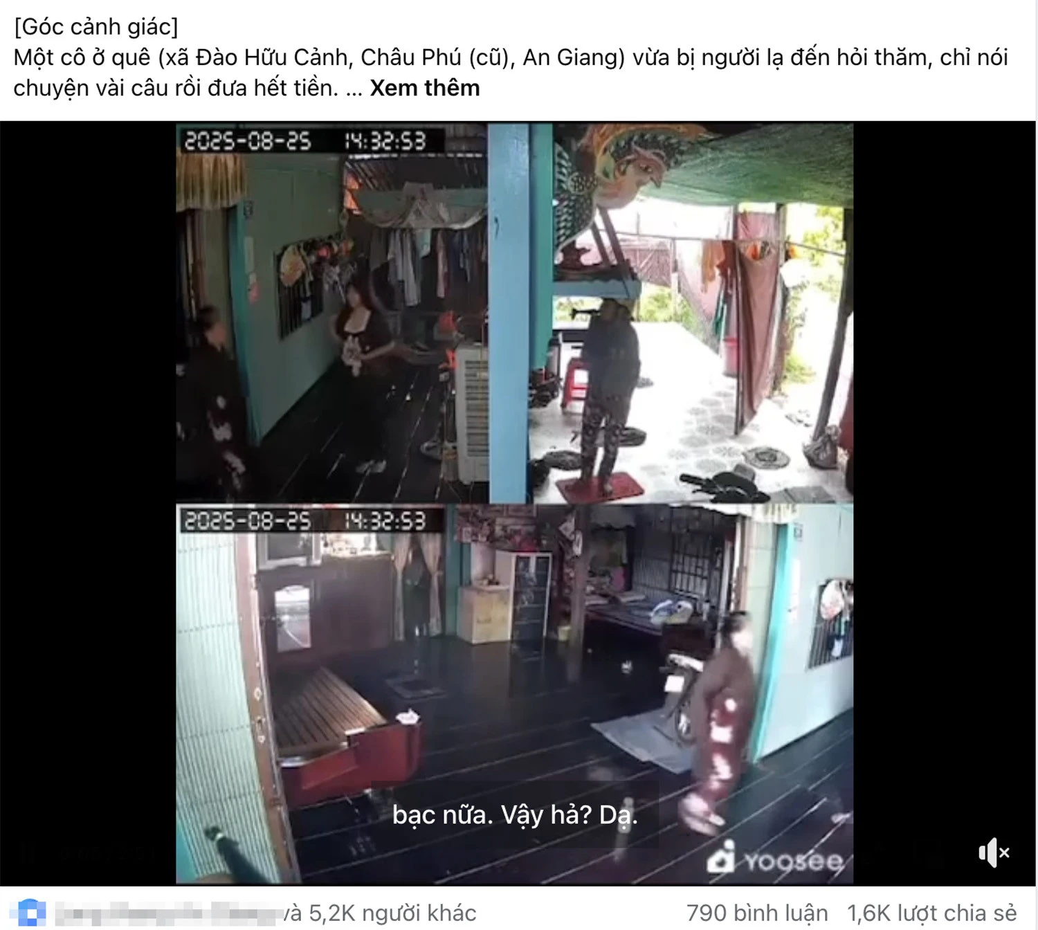 Vừa qua, nhiều trang mạng xã hội chia sẻ đoạn clip dài khoảng 3 phút, ghi lại hình ảnh tại nhà dân thuộc xã Thạnh Mỹ Tây , tỉnh An Giang , kèm nội dung “một người cô ở quê bị người lạ đến hỏi thăm, chỉ nói chuyện ít câu rồi đưa hết tiền. Mong bà con ở quê cảnh giác ”.