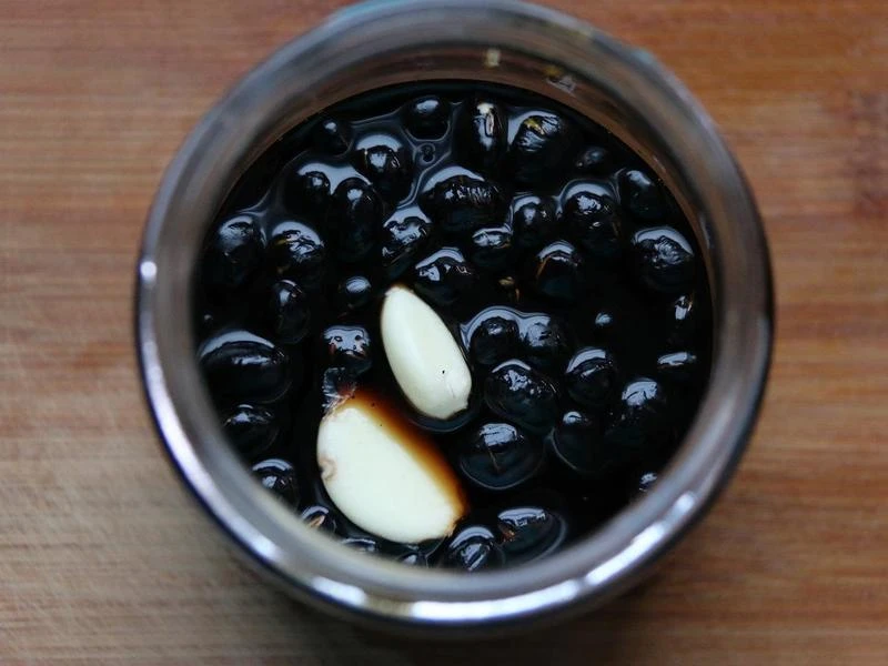 Bước 2: Cho đậu đen vào lọ thủy tinh đã khử trùng và thật khô ráo. Sau đó đổ giấm đen balsamic ngập đậu, cho 2 tép tỏi vào. Đậy kín lọ và để nơi thoáng mát ngâm khoảng 3 ngày. Khi đậu đen đã ngấm giấm hoàn toàn là có thể ăn được.