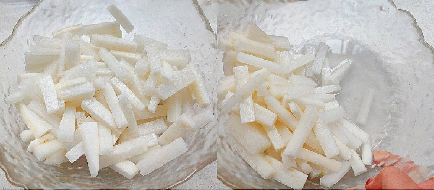 Bước 1: Gọt bỏ vỏ, rửa sạch củ cải, thái lát mỏng hoặc miếng miếng nhỏ hình con chì. Cho củ cải đã thái lát vào thố, thêm một lượng muối vừa đủ, ướp trong 15-20 phút để loại bỏ nước thừa và tăng độ giòn.