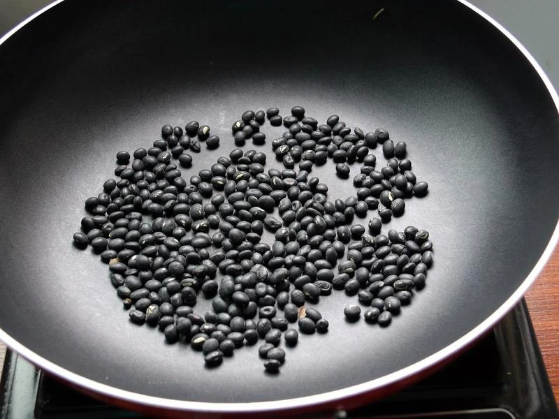 Đổ đậu đen vào chiếc chảo sạch, rang trên lửa lớn. Hơi nước sẽ bốc lên, dùng đũa đảo liên tục cho tới khi hết hơi nước thì chuyển sang lửa vừa và nhỏ để rang chậm.