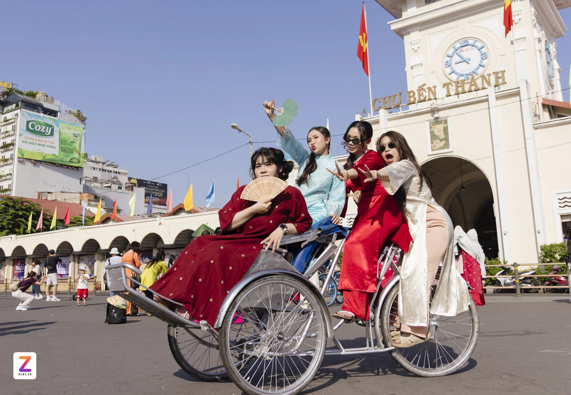 | Nhóm bạn trẻ mặc áo dài, ngồi trên xích lô, chụp ảnh Tết trước chợ Bến Thành. Ảnh: Phương Lâm. |