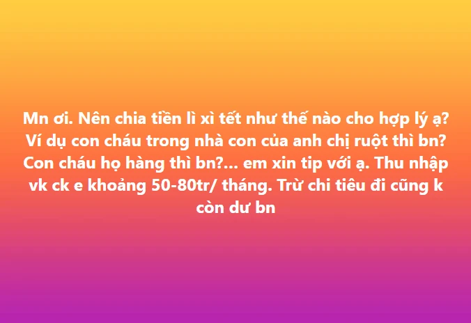 Theo chia sẻ, vợ chồng này có mức thu nhập được xem là khá ổn so với mặt bằng chung. Tuy nhiên, sau khi trừ các khoản chi tiêu cố định hàng tháng như sinh hoạt, nhà cửa, con cái, tiết kiệm..., số tiền dư thực tế không quá dồi dào. Đến Tết, khi phải chuẩn bị lì xì cho con cháu trong nhà, rồi đến con cháu họ hàng, họ bắt đầu cảm thấy áp lực. Lì xì ít thì sợ bị đánh giá là "keo", mà lì xì nhiều thì tổng cộng lại thành con số không hề nhỏ.