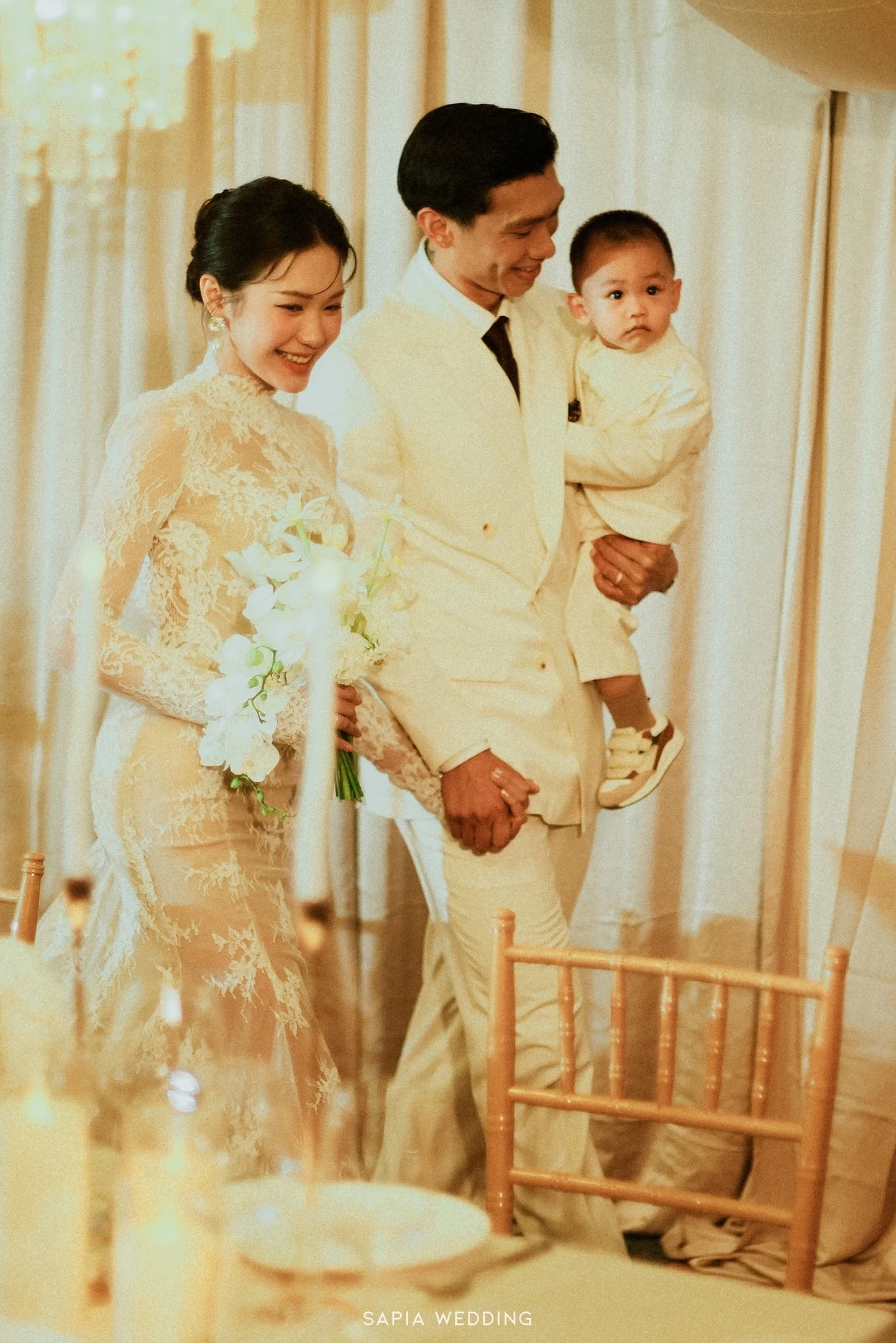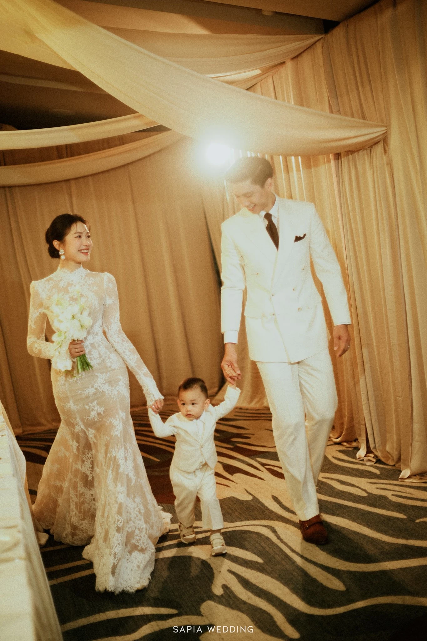 Trong loạt ảnh kỷ niệm 2 năm ngày cưới, Doãn Hải My cùng chồng và con trai xuất hiện trong không gian ấm áp, cả ba diện trang phục trắng đồng điệu. Người đẹp sinh năm 2001 gây ấn tượng với chiếc váy ren dài tay ôm sát, tôn dáng và khéo léo khoe đường cong mềm mại. Làn da sáng mịn, mái tóc búi thấp cùng đôi hoa tai ngọc trai giúp cô giữ được vẻ thanh lịch, tinh tế. Doãn Hải My vẫn nổi bật nhờ thần thái nhẹ nhàng, tự nhiên, vẻ đẹp của người phụ nữ đang ở giai đoạn rực rỡ nhất của hạnh phúc.