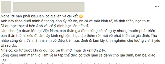 Không chỉ giỏi giang, có học thức, theo cô gái, điều kiện kinh tế của chàng trai cũng khiến nhiều người phải ghen tị: "Thu nhập cũng ổn nữa, mà nhà anh có điều kiện, xác định đi làm lấy kinh nghiệm chứ lương chỉ là yếu tố sau đó. Anh có nhà từ trước khi đi du học, xe thì mới mua, tầm hơn 2 tỷ".
