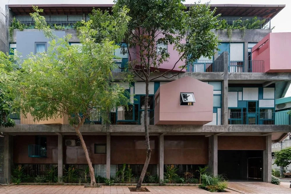 Thiết kế vô cùng thú vị khi sắp xếp các khối nhà nhỏ nhô ra thụt vào ngẫu hững như những chiếc tổ treo san sát nhau. Ngay góc đường trông tổ hợp vô cùng nổi bật.