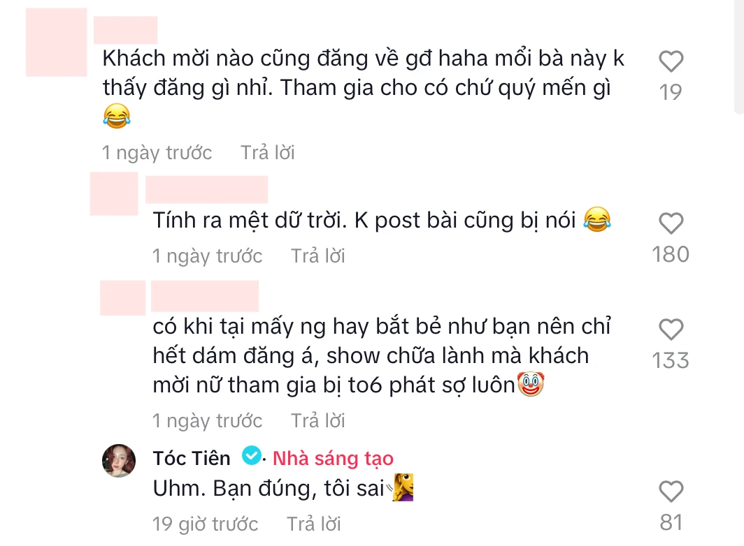Thế nhưng mới đây, tranh cãi lại nổ ra khi một số cư dân mạng vào thẳng trang cá nhân của Tóc Tiên để mỉa mai, chỉ trích cho rằng cô không chia sẻ hình ảnh, thông tin về Gia đình Haha vì “tham gia cho có chứ quý mến gì”. Trước ý kiến này, Tóc Tiên bất ngờ đăng tải một đoạn clip với thái độ khó chịu, xen lẫn bất lực. Trong clip, cô thẳng thắn nói: “Tôi không thích Chú Sáu ( Jun Phạm ), Bàm Công Nui ( Bùi Công Nam ), Vũ Đức Thiện (Rhymastic), Tâm Tiểu Thư ( Ngọc Thanh Tâm ), Ngôi sao Duy Khánh (Duy Khánh), các bạn lan tỏa đi, chữa lành lên”.