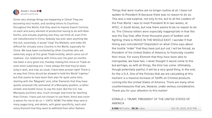 Trong một bài đăng trên nền tảng mạng xã hội Truth Social tối 10/10, Tổng thống Mỹ Donald Trump cho biết: “Những điều hết sức kỳ lạ đang xảy ra ở Trung Quốc!” và Trung Quốc đã “gửi thư đến các quốc gia trên khắp thế giới , tuyên bố rằng họ muốn áp đặt kiểm soát xuất khẩu đối với từng yếu tố trong sản xuất liên quan đến đất hiếm, và gần như bất kỳ thứ gì khác mà họ có thể nghĩ ra, ngay cả khi chúng không được sản xuất tại Trung Quốc”.