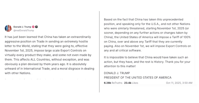 Sau đó trong một bài khác, cũng đăng trên nền tảng mạng xã hội Truth Social, Tổng thống Trump tuyên bố: “Dựa trên thực tế rằng Trung Quốc đã đưa ra lập trường chưa từng có này, và chỉ thay mặt cho Mỹ, chứ không phải các quốc gia khác cũng đang bị đe dọa tương tự, kể từ ngày 1/11/2025 (hoặc sớm hơn, tùy thuộc vào bất kỳ hành động hay thay đổi nào khác mà Trung Quốc thực hiện), Mỹ sẽ áp đặt mức thuế quan 100% đối với Trung Quốc, cộng thêm so với bất kỳ mức thuế nào mà họ hiện đang phải trả. Đồng thời, vào ngày 1/11, chúng tôi cũng sẽ áp đặt các biện pháp kiểm soát xuất khẩu đối với toàn bộ phần mềm quan trọng”.