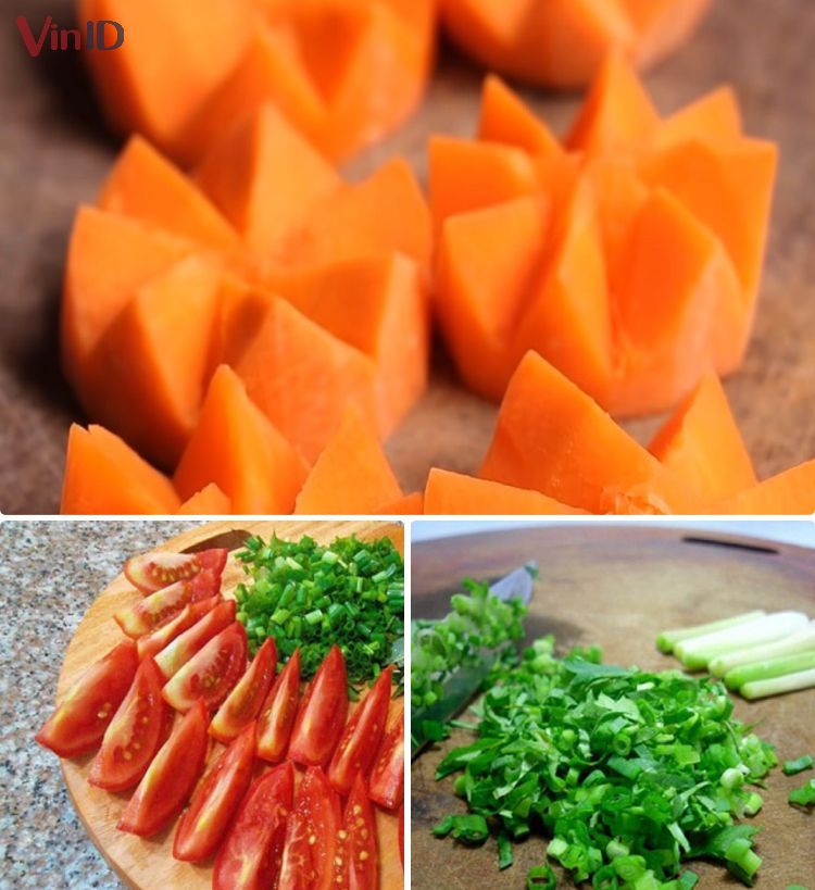 Rửa sạch các loại rau củ.Khoai tây gọt vỏ, cắt miếng vừa ăn. Đun sôi dầu, đổ khoai tây vào chiên vàng đều 2 mặt thì vớt ra, để ráo dầu.Cà rốt gọt vỏ, có thể tỉa hoa tùy theo sở thích.Cà chua cắt múi cau.Hành ngò cắt nhỏ.Tỏi lột vỏ, băm nhuyễn.