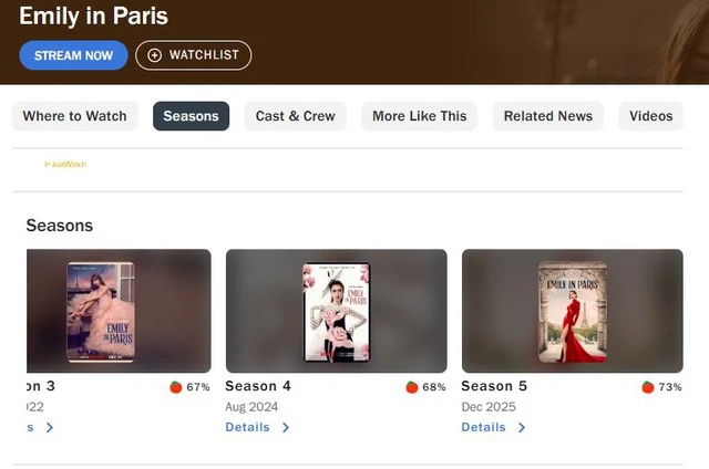 Đặc biệt hơn, Emily in Paris luôn bị công chúng dè bĩu bởi nội dung ngôn tình phi lý, lỗi thời và sến súa, song vẫn có không ít người xem không sót tập nào vì cuốn đến kỳ lạ. Trên Rotten Tomatoes, giới phê bình thực chất không quá “kỳ thị” bộ phim khi ngoài mùa 2, tất cả các mùa còn lại đều đang có điểm “cà tươi”. Ngoài ra, Emily in Paris luôn đạt thành tích số liệu ấn tượng, như mùa 2 trở thành dự án được xem nhiều nhất năm trên Netflix, mùa 1 cũng thống trị top đầu của riêng series hài kịch, mùa 3 thu về hơn 117 triệu giờ xem toàn cầu chỉ trong tuần đầu tiên…