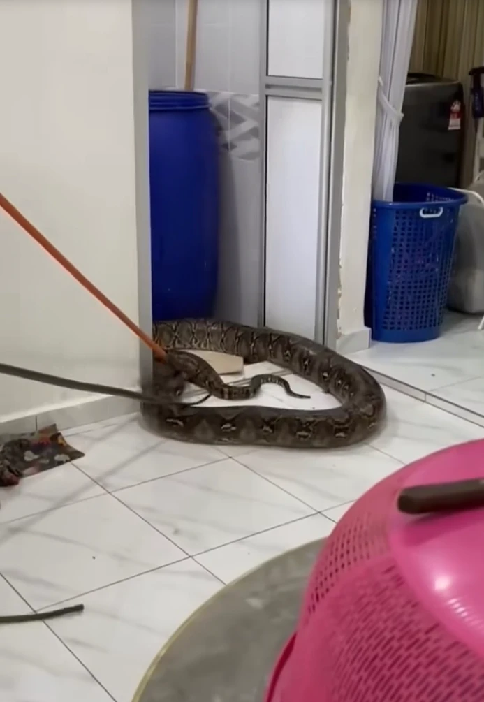 Gia đình một cô giáo tại Sungai Petani – Malaysia hoảng hồn khi một con trăn hoa nặng khoảng 60 kg bất ngờ rơi xuống từ trần nhà vệ sinh của họ.