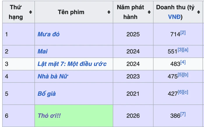 Mai đang giữ vị trí thứ 2 doanh thu phim Việt cao với 551 tỷ, Thỏ Ơi! ở vị trí thứ 6 với doanh thu 386 tỷ. – Nguồn: Wikipedia