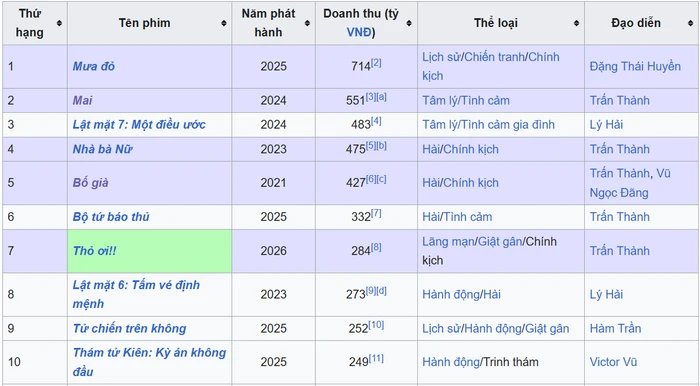 Trấn Thành chính thức ghi tên cả 5 phim Tết vào top 10 phim điện ảnh Việt có doanh thu cao nhất mọi thời đại, một kỷ lục chưa từng có trong lịch sử phòng vé nội địa.