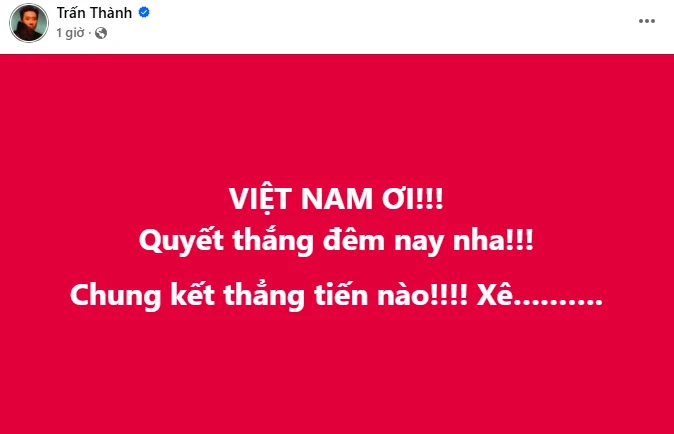 Trên trang cá nhân, Trấn Thành khiến cộng đồng mạng phấn khích khi đăng tải hình ảnh nền đỏ rực kèm dòng chữ đầy khí thế: " Việt Nam ơi! Quyết thắng đêm nay nha! Chung kết thẳng tiến nào!" . Chỉ với vài câu ngắn gọn nhưng đầy năng lượng, bài đăng nhanh chóng thu hút lượng tương tác lớn, thể hiện rõ sự kỳ vọng của nam MC vào một chiến thắng cho U23 Việt Nam.