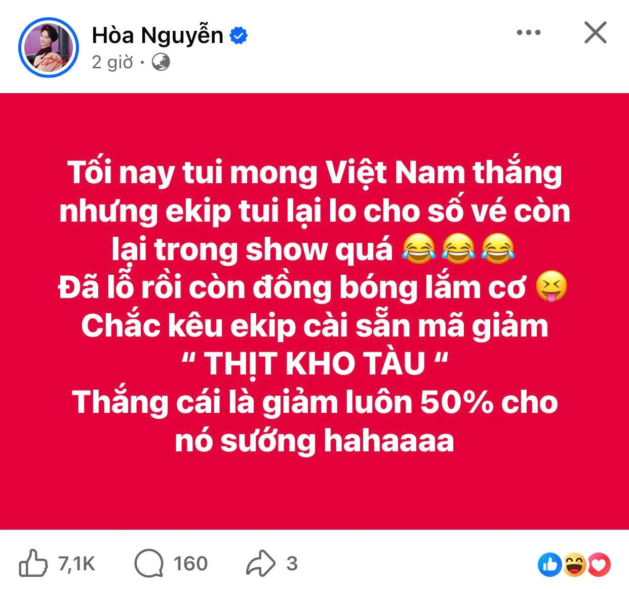 Cũng hòa chung nhịp đập đó, Hòa Minzy mang đến không khí vừa hào hứng vừa dí dỏm. Nữ ca sĩ chia sẻ mong muốn đội tuyển giành chiến thắng nhưng không quên "than thở" chuyện ekip đang lo lắng vì... lượng vé show còn lại. Hòa Minzy còn hứa hẹn tạo mã giảm giá 50% nếu đội tuyển U23 Việt Nam giành chiến thắng. Cách cổ vũ hài hước, gần gũi của Hòa Nguyễn khiến nhiều khán giả thích thú, để lại hàng loạt bình luận cười nghiêng ngả bên dưới.