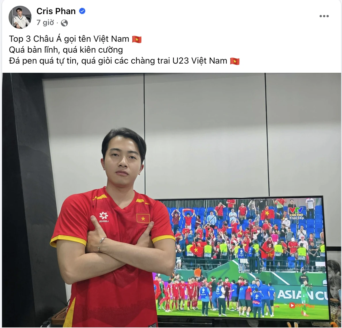 Ngoài ra, dàn nghệ sĩ, hoa hậu, á hậu Việt cũng đồng loạt lên tiếng chúc mừng. Khánh Vân , Ngọc Hằng , Thanh Thủy và Lê Hoàng Phương , Ngô Kiế Huy , Cris Phan … đều chia sẻ niềm tự hào, gửi lời chúc mừng tới U23 Việt Nam sau trận cầu đáng nhớ. Mỗi người một cách thể hiện, nhưng điểm chung là tinh thần phấn khởi, tự hào lan tỏa khắp mạng xã hội.