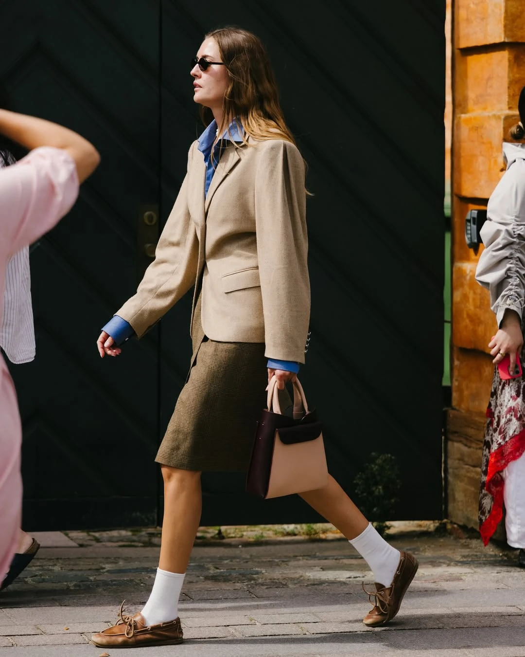 Kết hợp giày lười Miu Miu với tất trắng cổ cao, một chiếc áo sơ mi xanh nhạt để tạo điểm nhấn màu sắc . ẢNH: @NADJABENDER