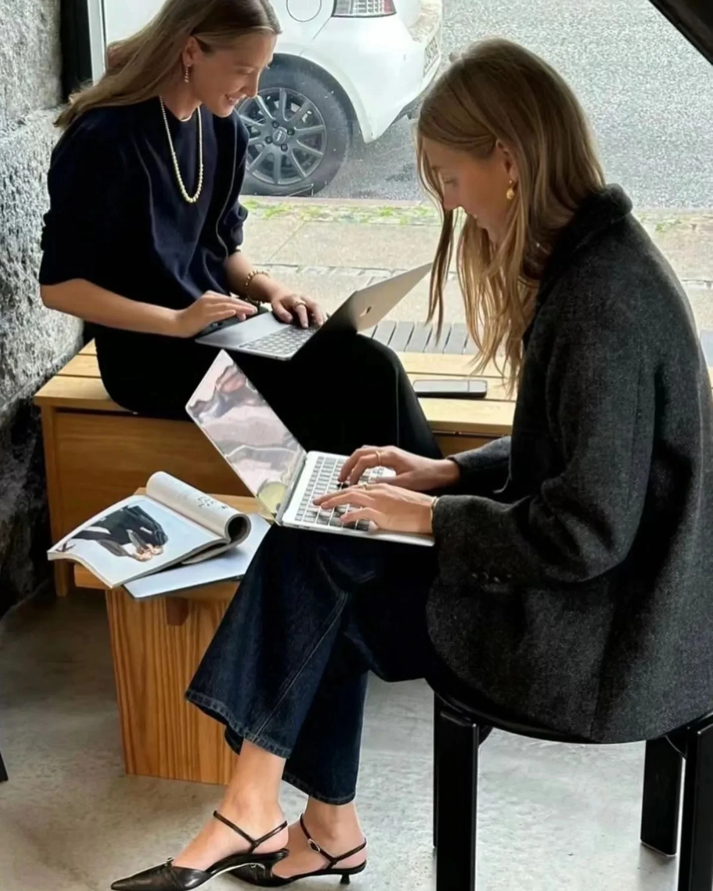 Áo len và blazer vải dạ kết hợp cùng quần jeans tối màu, điểm nhấn bằng phụ kiện trang sức mảnh và giày slingback gót thấp – vừa thoải mái làm việc, vừa giữ được vẻ thanh lịch chuẩn mực nơi công sở.