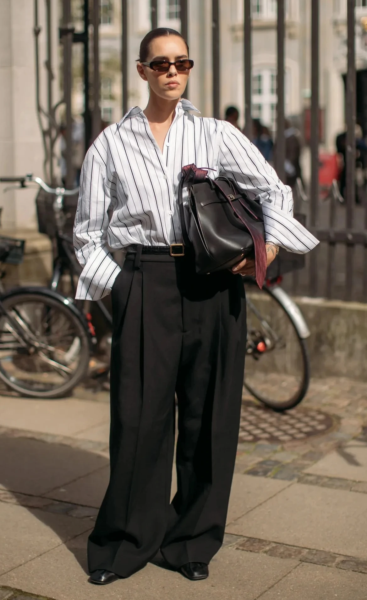 Kết hợp giữa quần tây may đo và áo sơ mi sọc trở thành lựa chọn thời trang thanh lịch nhưng không kém phần hiện đại cho ngày thu . ẢNH: @CHRISTINA_STOUGAARD