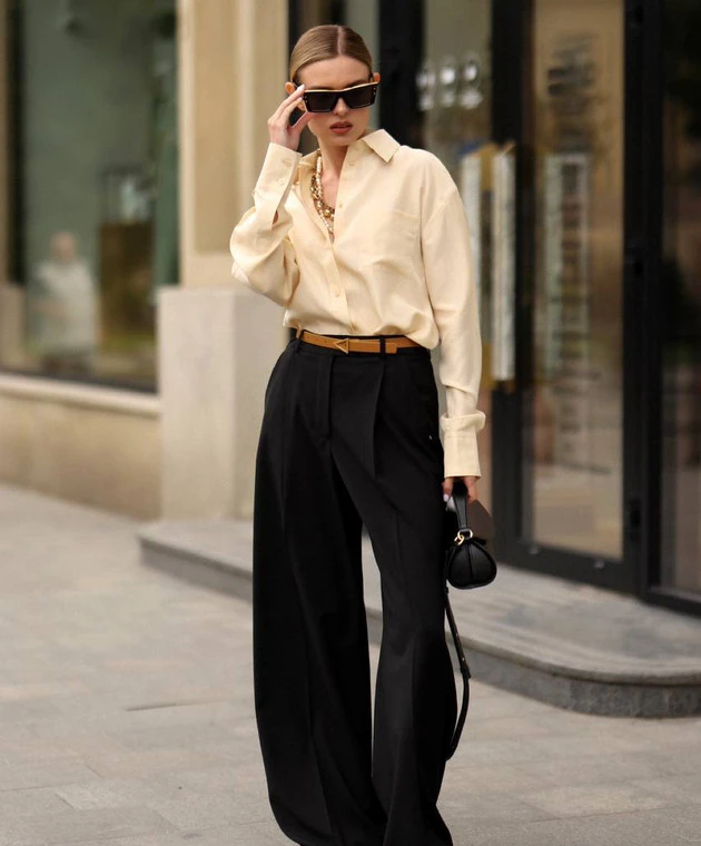 Trong trường hợp này, chúng ta có thể chọn một chiếc áo sơ mi trơn vừa vặn, cài hờ cúc, kết hợp với quần ống rộng thanh lịch . ẢNH: MAX MARA