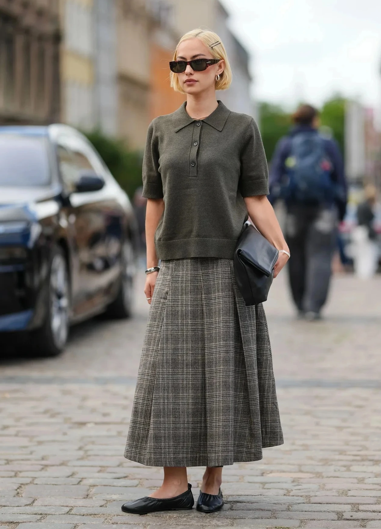 Chân váy vải tartan với các tông màu kinh điển như xám kết hợp với áo thun polo cùng tông hoặc áo len cổ sơ mi tay ngắn trẻ trung; nếu muốn thêm phần cá tính, hãy chọn giày ba lê đế bệt