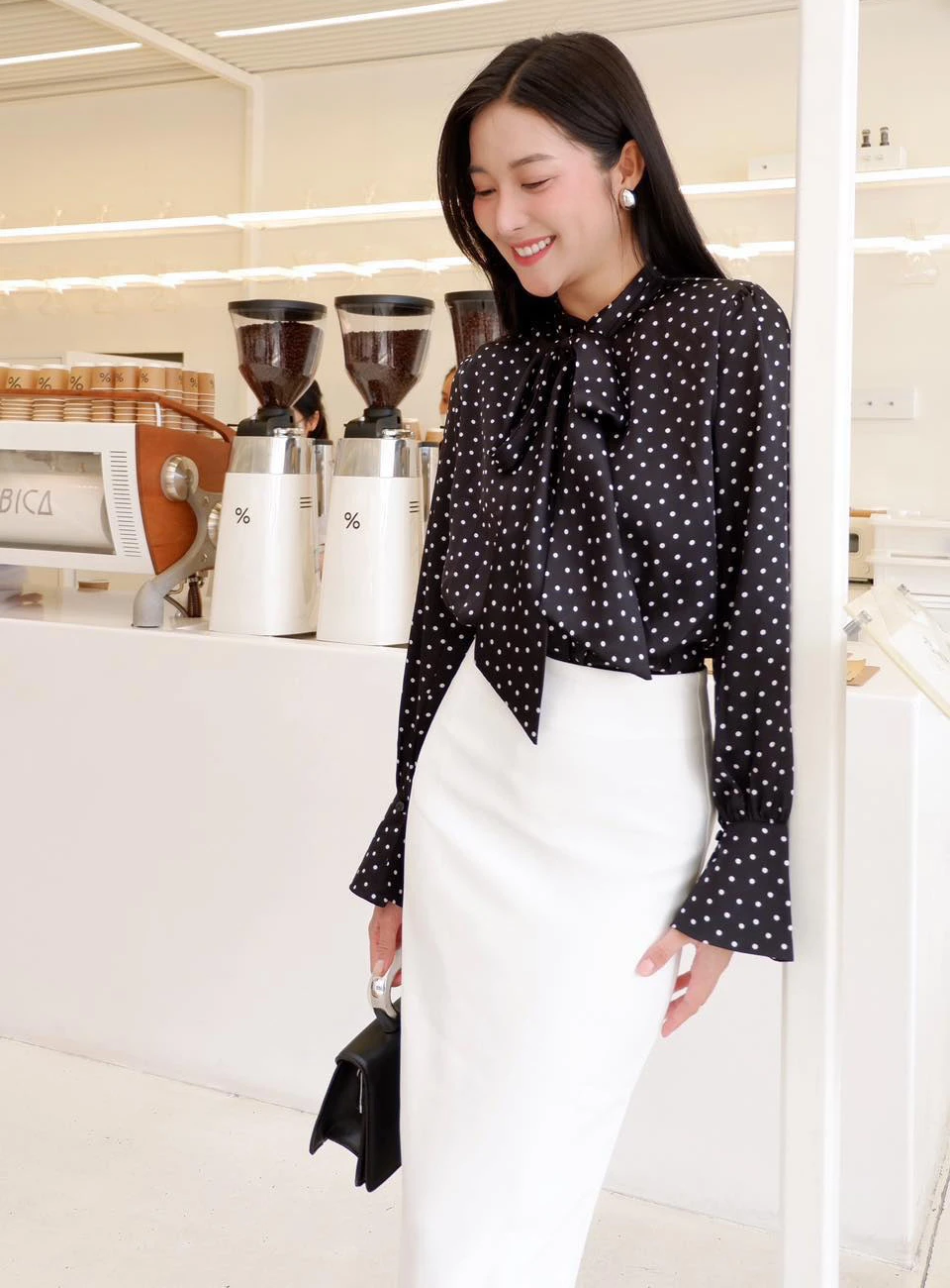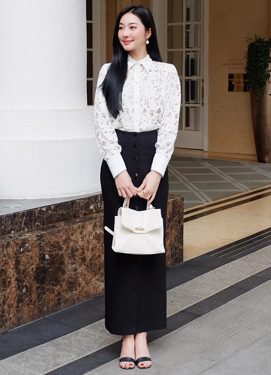 Sự kết hợp của bản phối trắng đen trên cặp đôi áo và chân váy dài luôn đem lại hiệu quả về mặt thẩm mỹ và công năng. Ngoài trang phục, đừng quên sử dụng giày, túi và phụ kiện bổ sung để bản phối thêm hoàn hảo