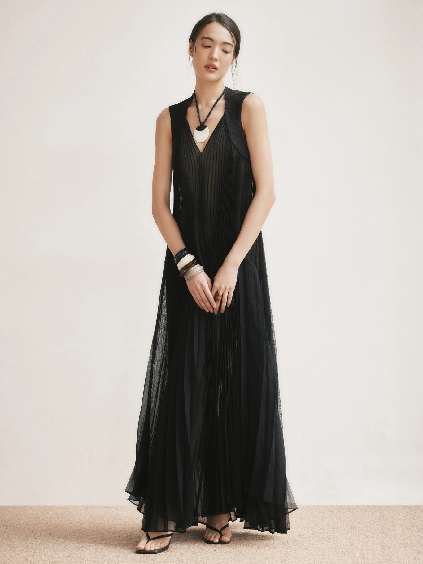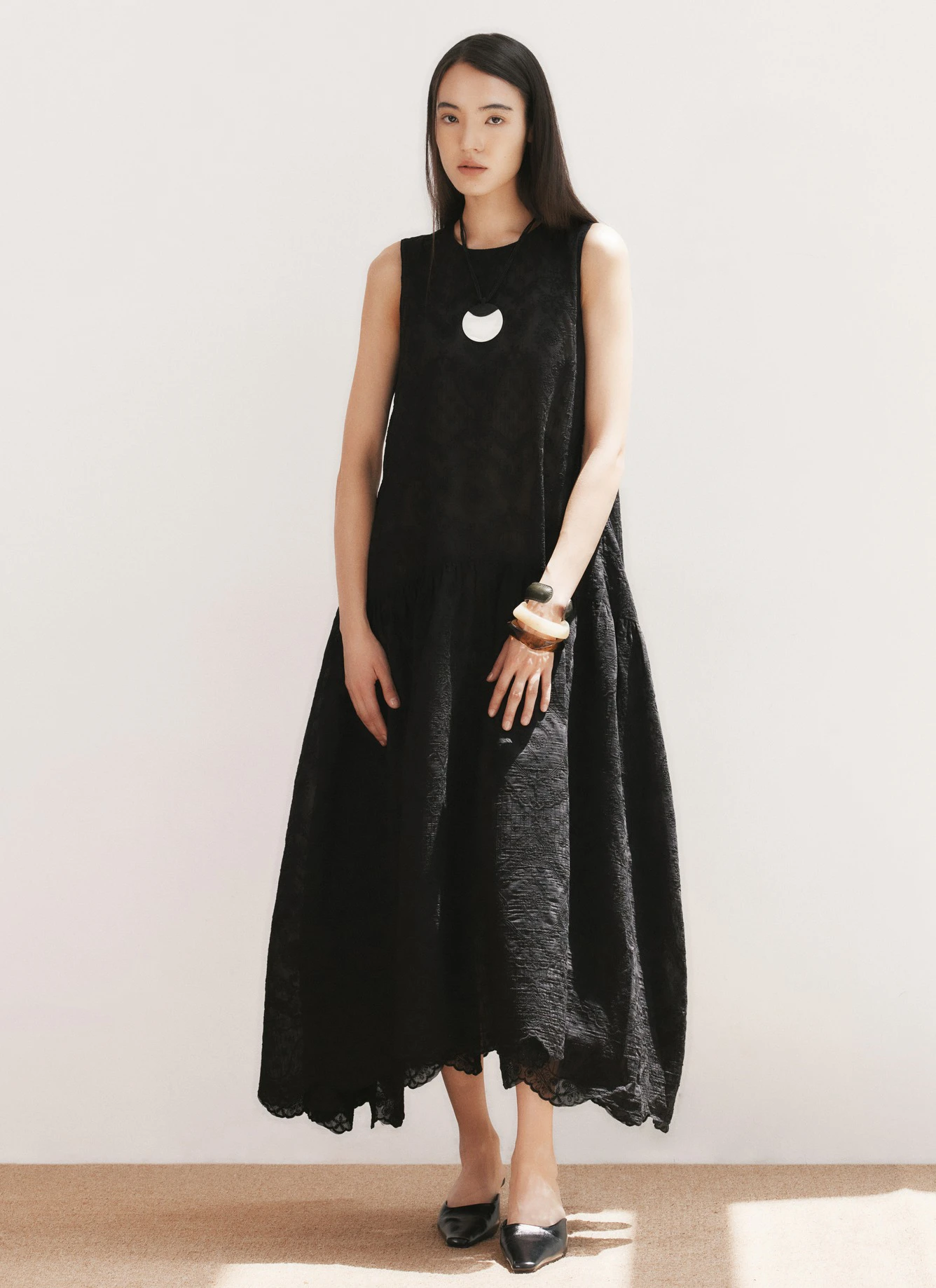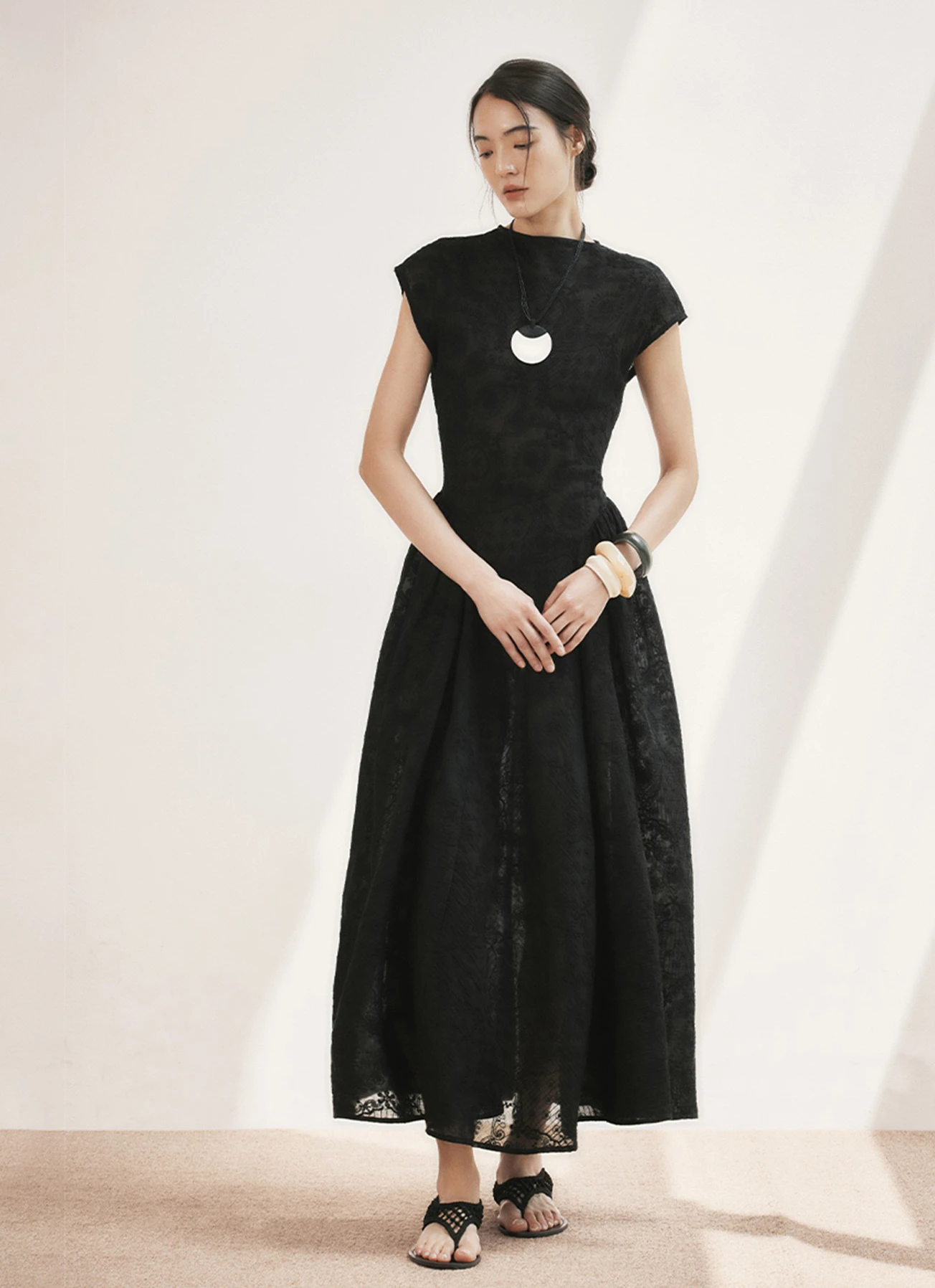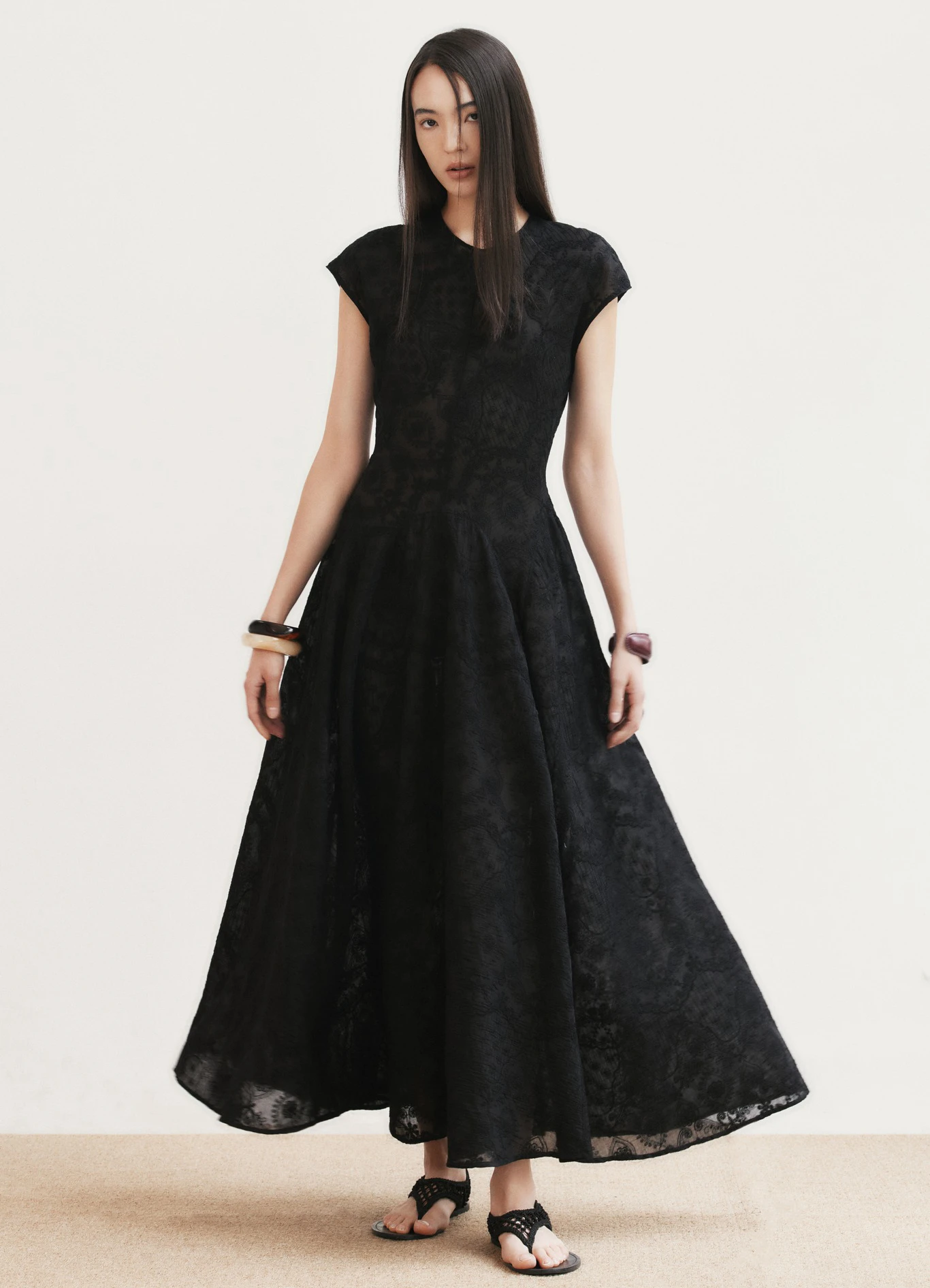 Các thiết kế váy dài dáng A từ vải tơ đũi, vải boil thêu hoa nổi tông màu đen, khéo léo tôn dáng bằng chi tiết suông nhẹ xếp ly, đường chiết eo sau hay đường cắt xéo vải 45 độ tạo nên dáng đầm ôm tự nhiên mà vẫn xòe rộng nhịp nhàng theo từng bước chân nàng