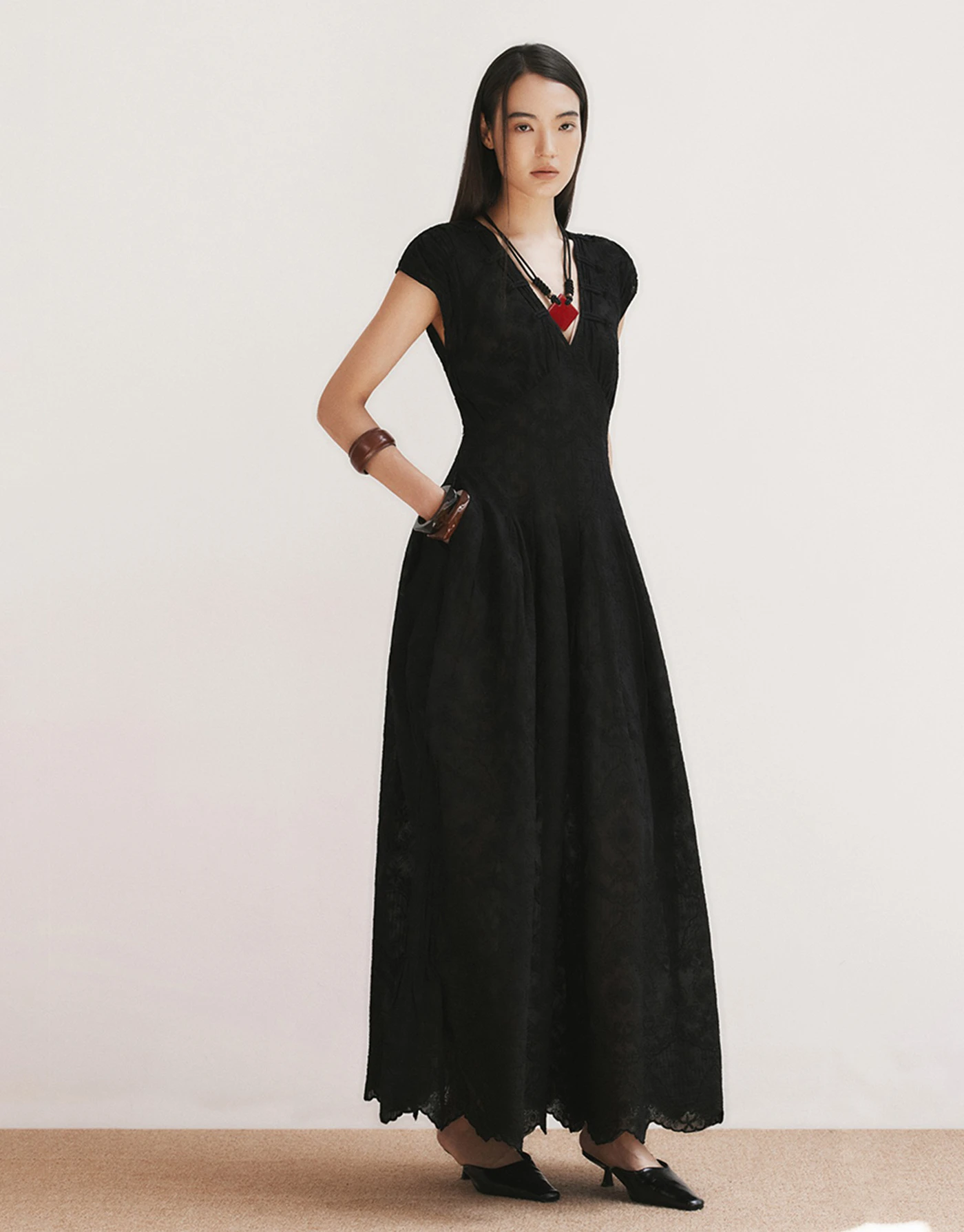 Đầm dài dáng chữ A, cổ xẻ hình chữ V tông màu đen tuyền trên chất vải cotton thêu hoa nổi trên bề mặt, phối cùng vòng cổ có mặt đeo màu đỏ rực